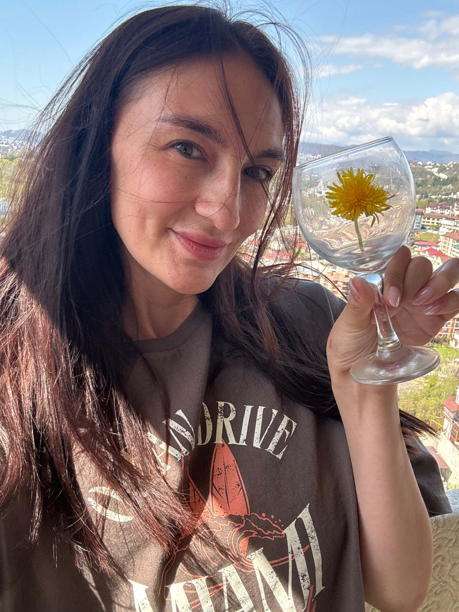 The image shows a woman holding a wine glass with a single dandelion flower inside. She appears to be taking a selfie, as the camera is positioned close to her face. She has long, dark hair and is wea…read more