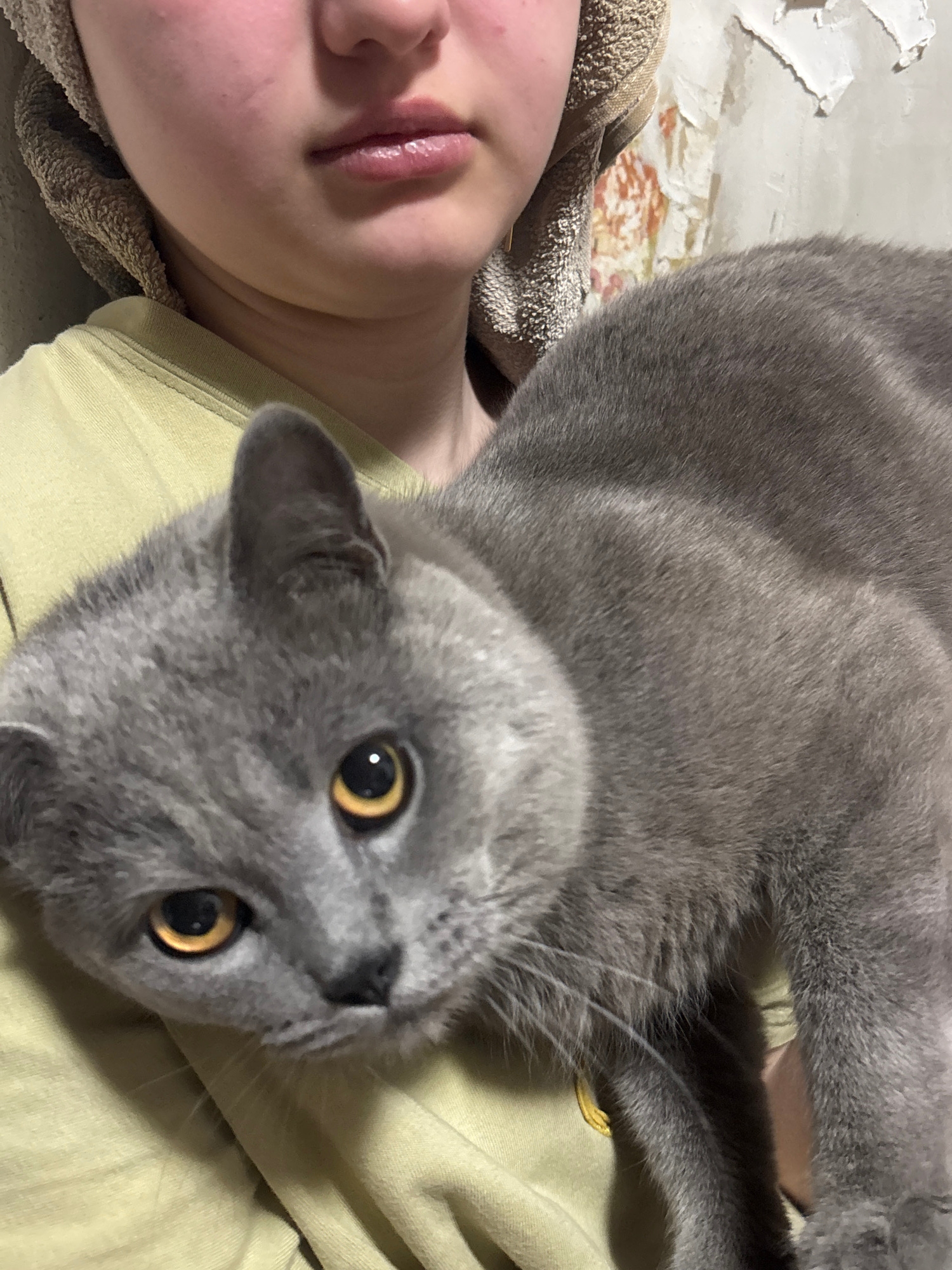 A close-up, top-down image captures an intimate indoor moment between a person and a grey cat in Фоки, Russia. The image is rotated, showing the person's head on the left side of the frame and the cat…read more