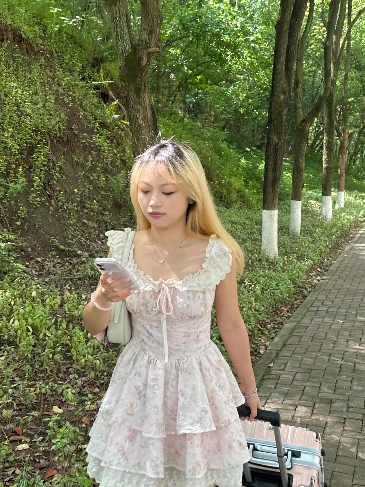 A young woman with long blonde hair, featuring darker roots, is depicted outdoors, likely walking or paused on a paved path in Jiangjin, China. She is looking down intently at a white smartphone held…read more