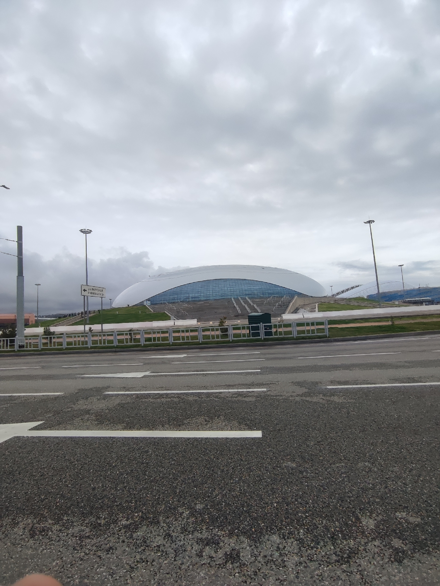 The image depicts a street scene in Sirius, Russia, with the Iceberg Skating Palace in the background under a cloudy sky. The foreground shows an asphalt road with white lane markings. A metal fence r…read more