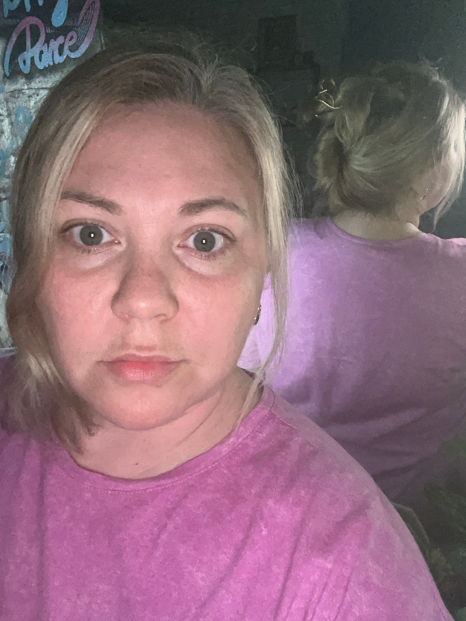 A selfie of a woman with blonde hair and fair skin wearing a pink t-shirt. Another woman with blonde hair is visible out of focus in the background, wearing a similar pink shirt. The background also c…read more