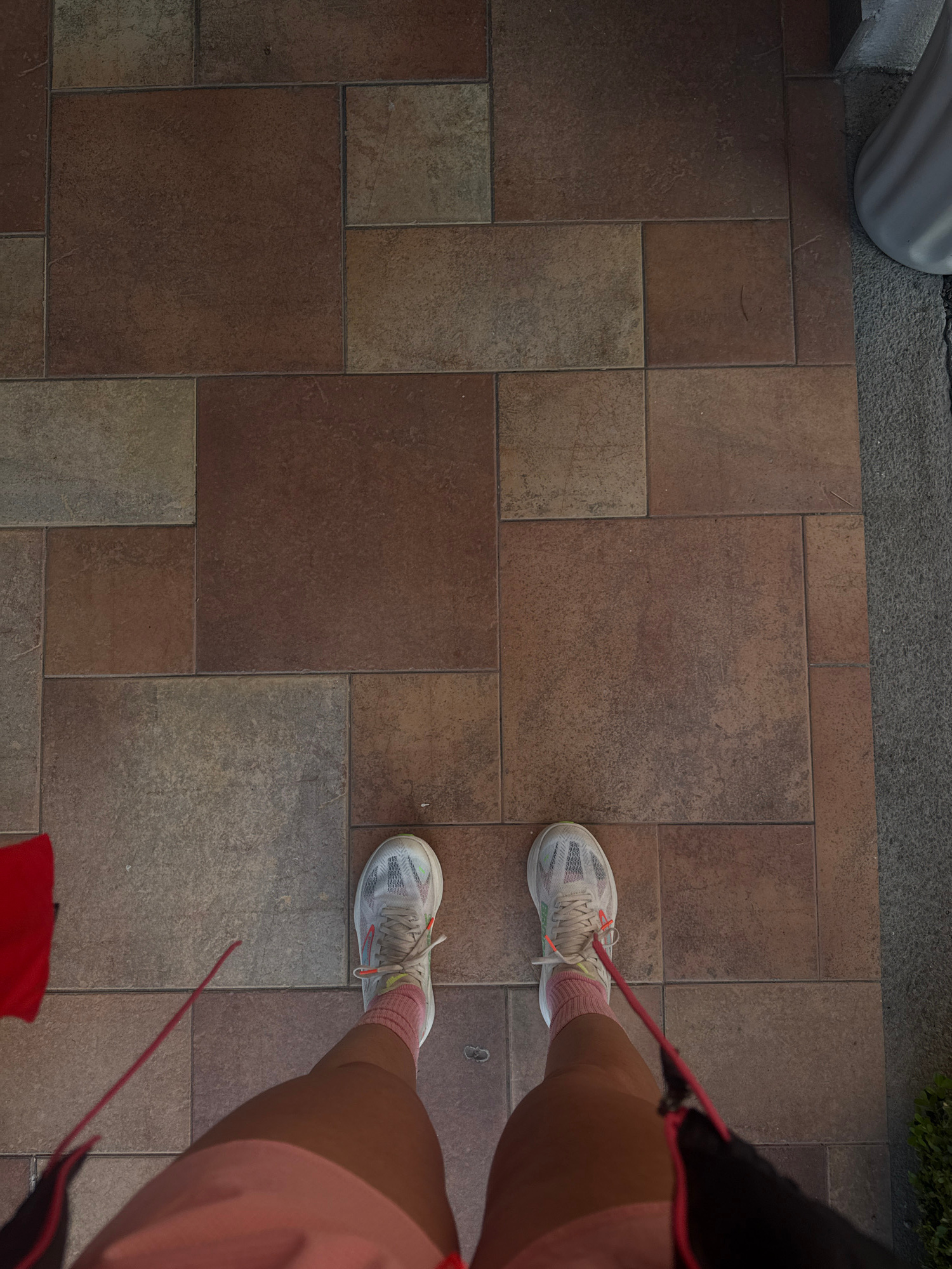 The image is a high-angle shot showing a person standing on a tiled surface. The tiles are arranged in a pattern of varying sizes and shades of brown. The person is wearing light-colored running shoesβ¦read more