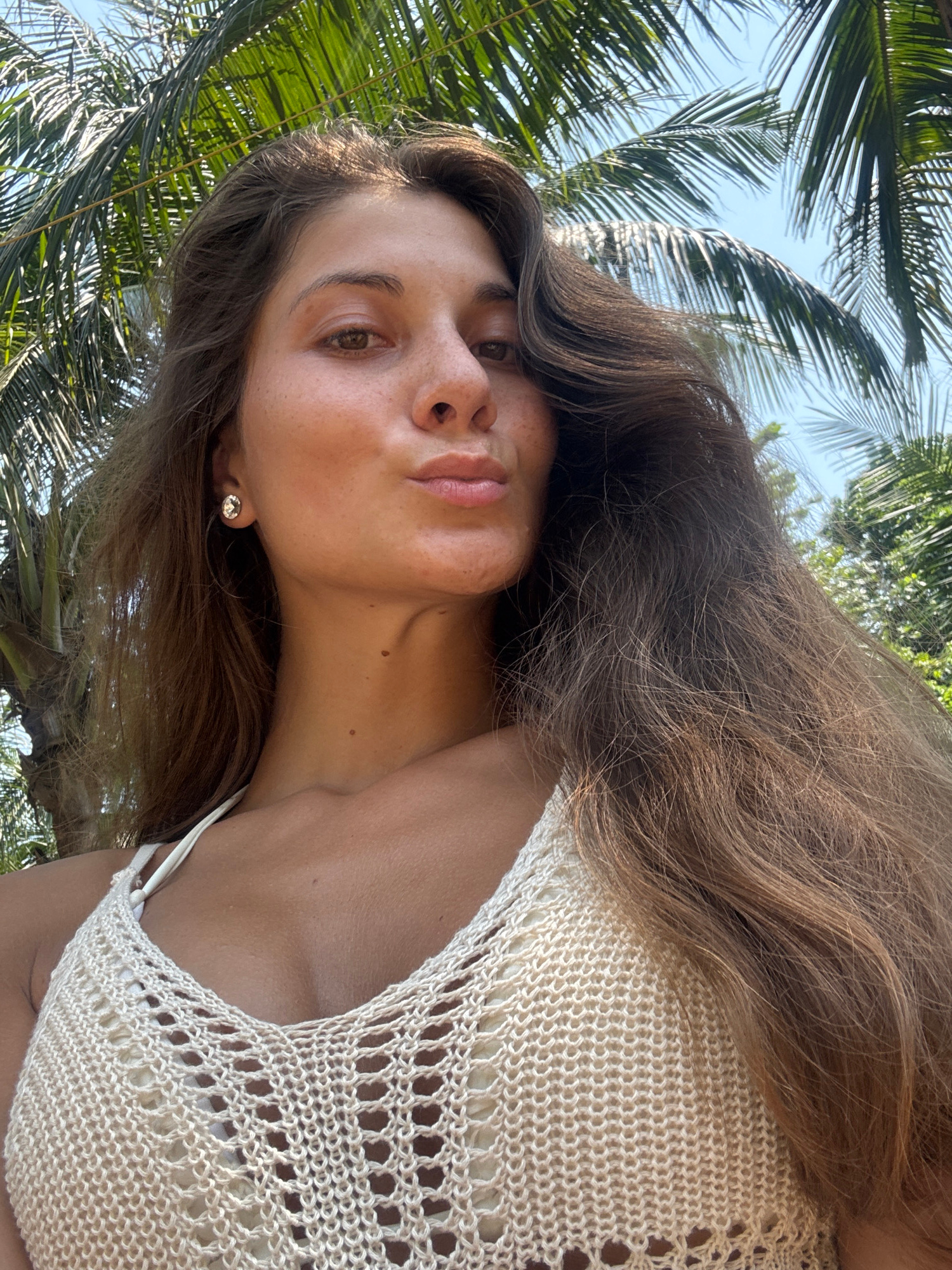 A young woman with long brown hair, fair skin, and a white knit top is pictured from a low angle against a backdrop of palm trees and a blue sky. The woman is wearing an earring. The location cannot b…read more