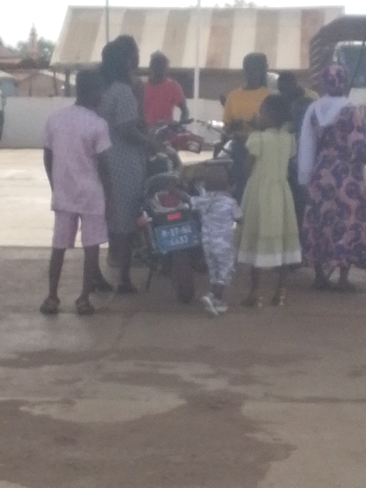 A group of people are gathered around a motorcycle. A child in a pink outfit stands to the left. A woman is dressed in grey. A child in camouflage stands near the motorcycle's license plate. Another c…read more