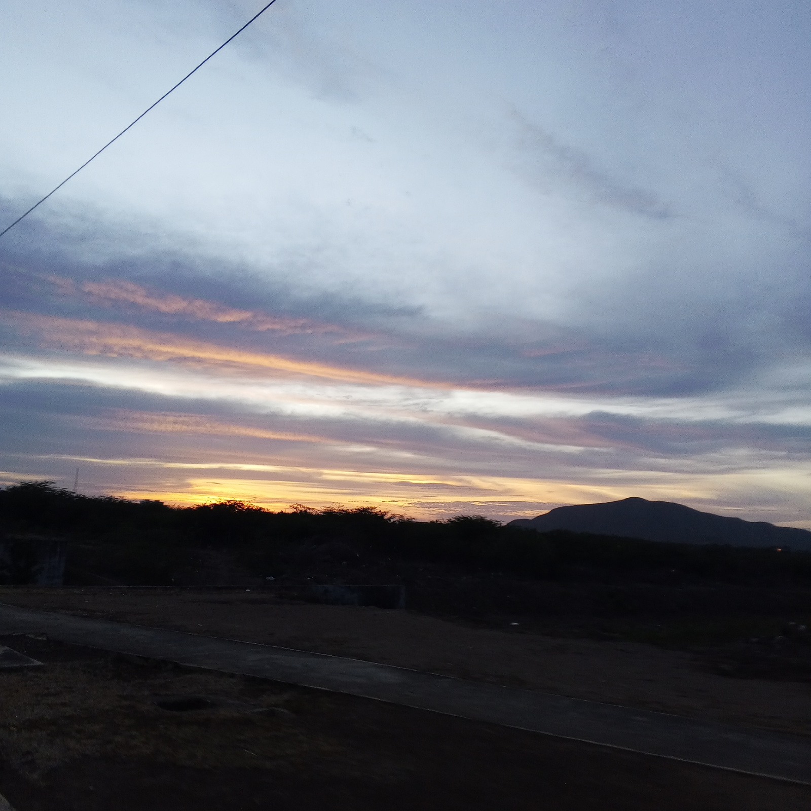 The image shows a landscape at dusk, possibly near the city of Unknown, Unknown. In the foreground, there is a road and some dark, undefined terrain. A line of trees or bushes is situated between theβ¦read more