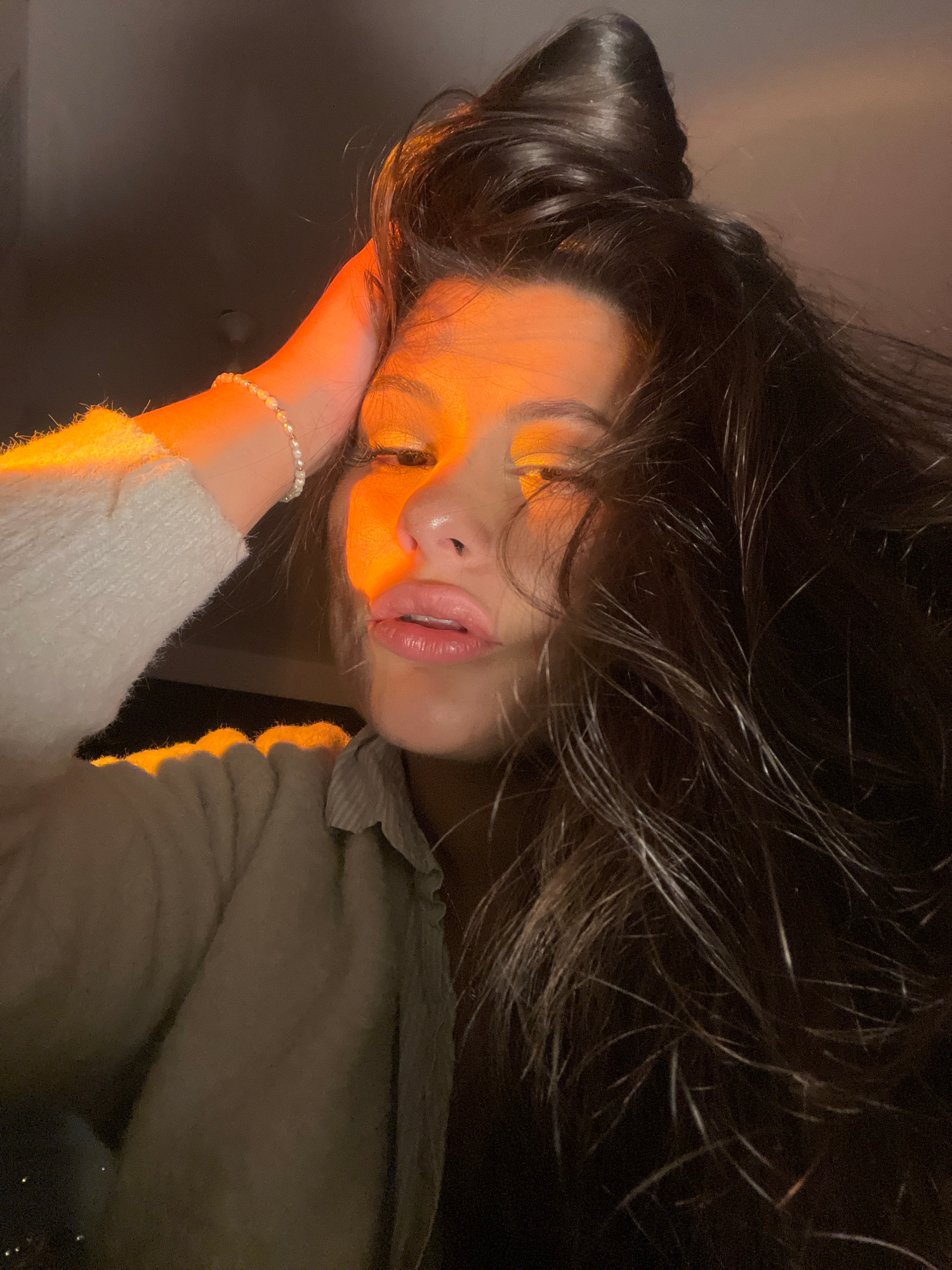 The image depicts a close-up, angled portrait of a single female-presenting individual, illuminated primarily by a strong orange-amber light source on the left side of the face and arm. The subject ha…read more
