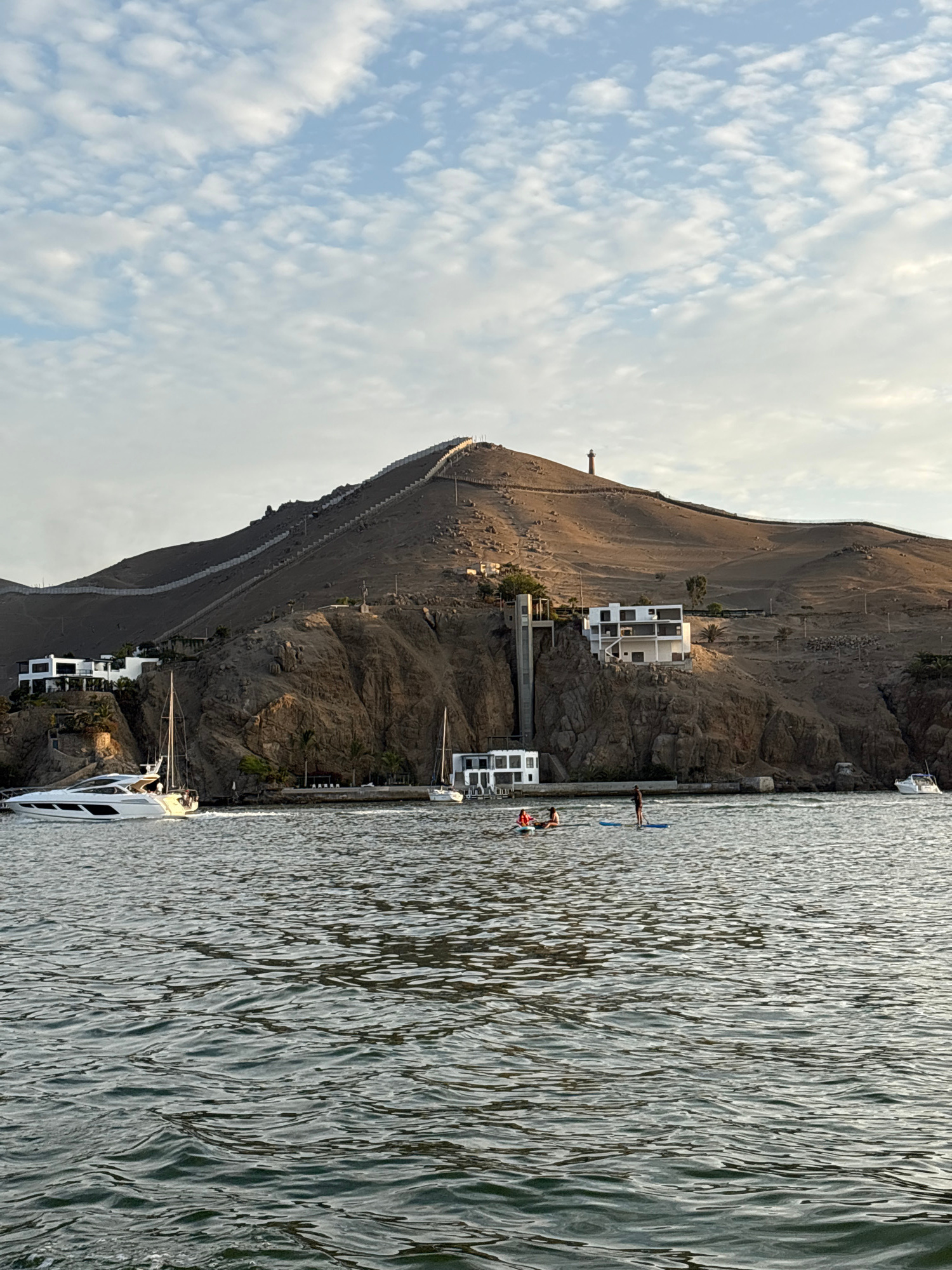 The image displays a coastal scene in Ancón, Peru, under a partially cloudy sky. The foreground is occupied by a body of dark, rippled water. A white motor yacht with dark windows navigates from left…read more