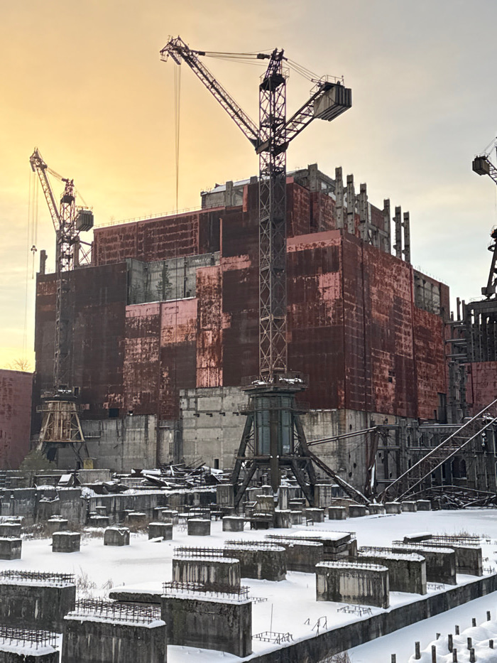 A rusted, decaying industrial structure dominates the scene. Several cranes are positioned around the building, suggesting ongoing construction or demolition. The building's facade is characterized by…read more