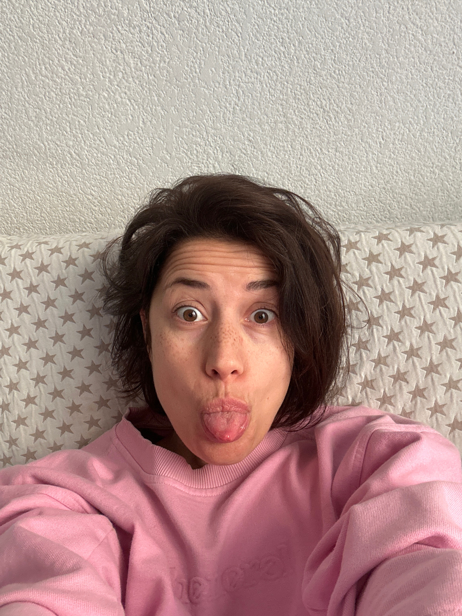 A portrait-oriented image captures a person making a playful expression while lying down indoors. The subject, an adult with short dark hair and brown eyes, looks directly at the camera with wide, exp…read more
