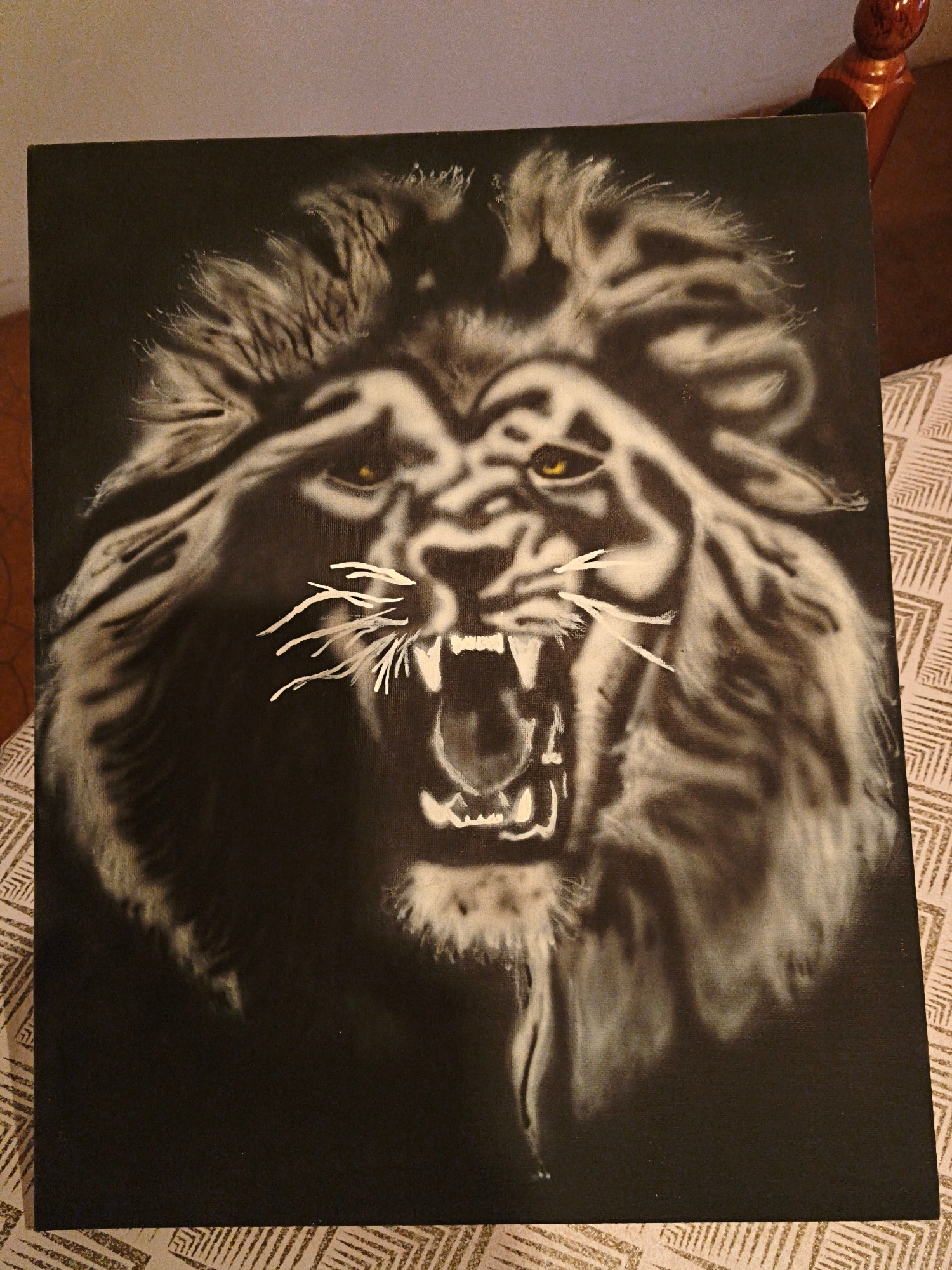 A painting of a roaring lion with a black background is on a table with a patterned cloth in Sant Esteve Sesrovires, Spain. The lion has a large mane and its mouth is open revealing its teeth. Its eye…read more