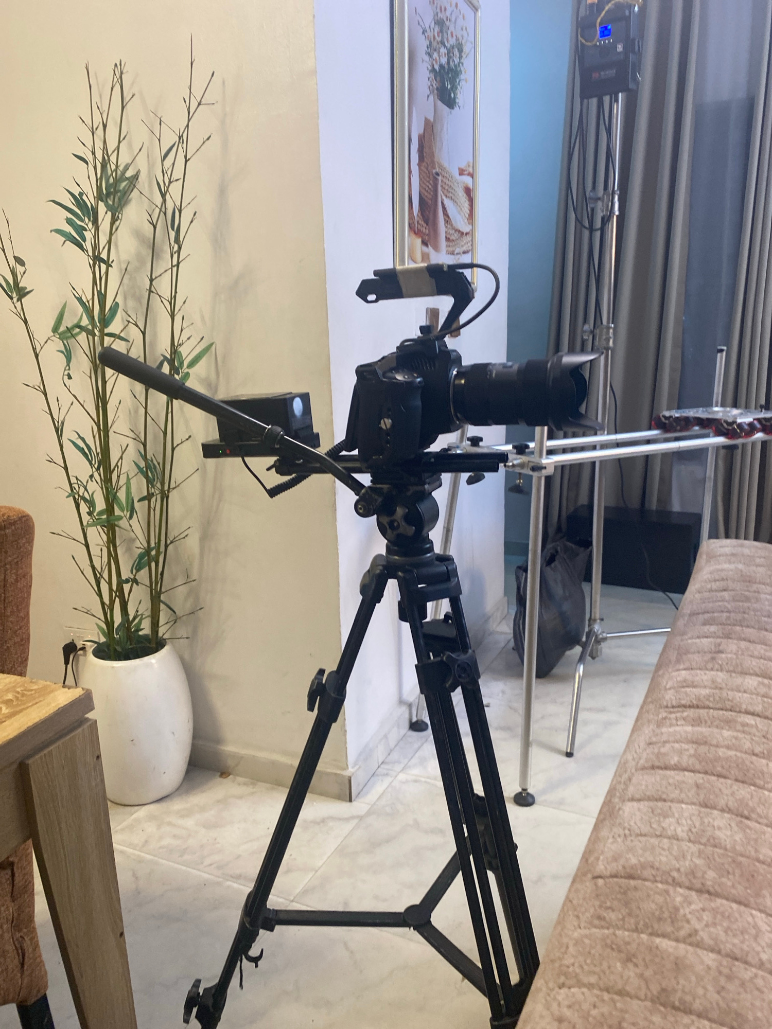 The image shows a professional camera setup on a tripod in an indoor setting. The camera is a black DSLR or mirrorless type with a large lens attached, and it's mounted on a heavy-duty tripod. The triβ¦read more