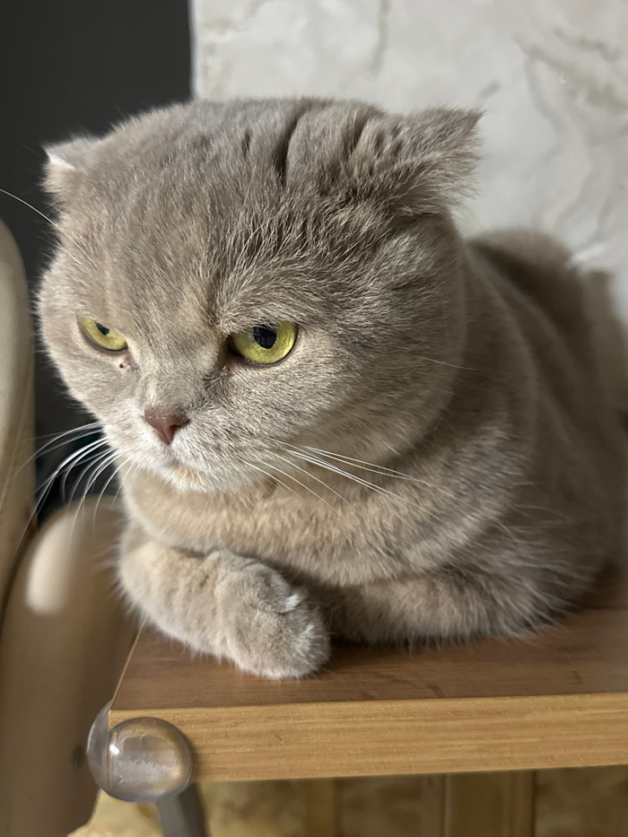 A Scottish Fold cat with gray fur and green eyes is lying on its side. The cat's paw rests near the edge of a wooden surface or piece of furniture. The background is blurred, but it seems to be a simp…read more