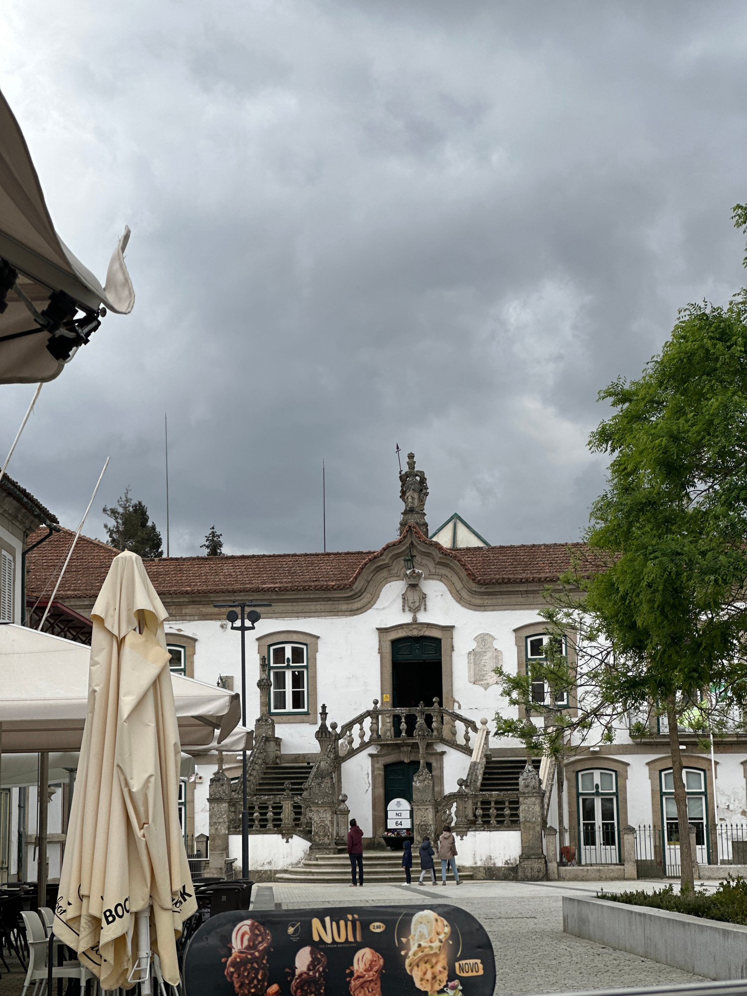 The image captures a scene in Vila Real, Portugal, dominated by a historic white building with an ornate stone staircase leading up to its entrance. A decorative roofline with terracotta tiles caps th…read more