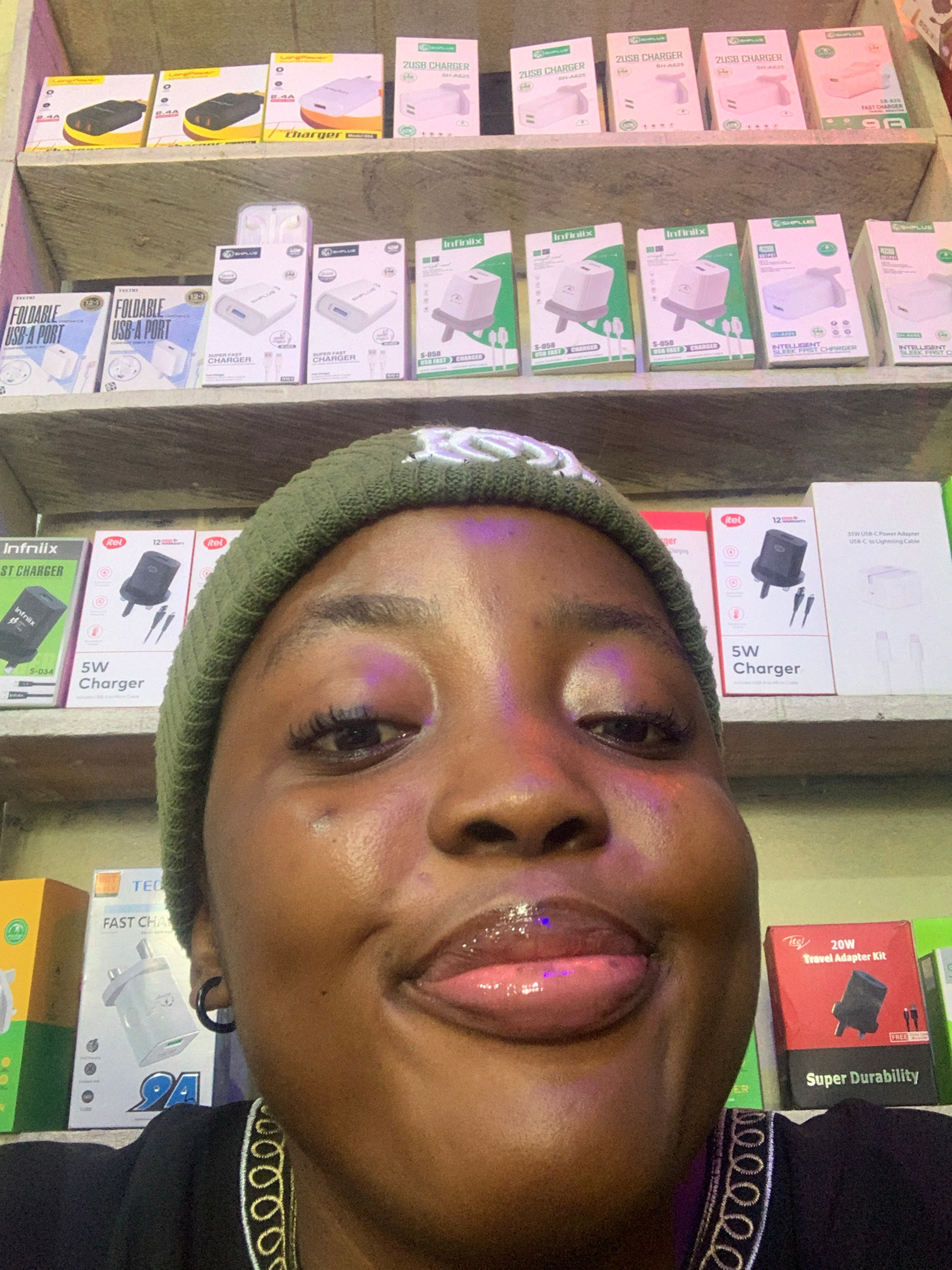 A close-up selfie of a young Black woman wearing a green knit hat with white lettering is positioned against a backdrop of shelves filled with packaged electronic accessories. The woman is wearing a b…read more