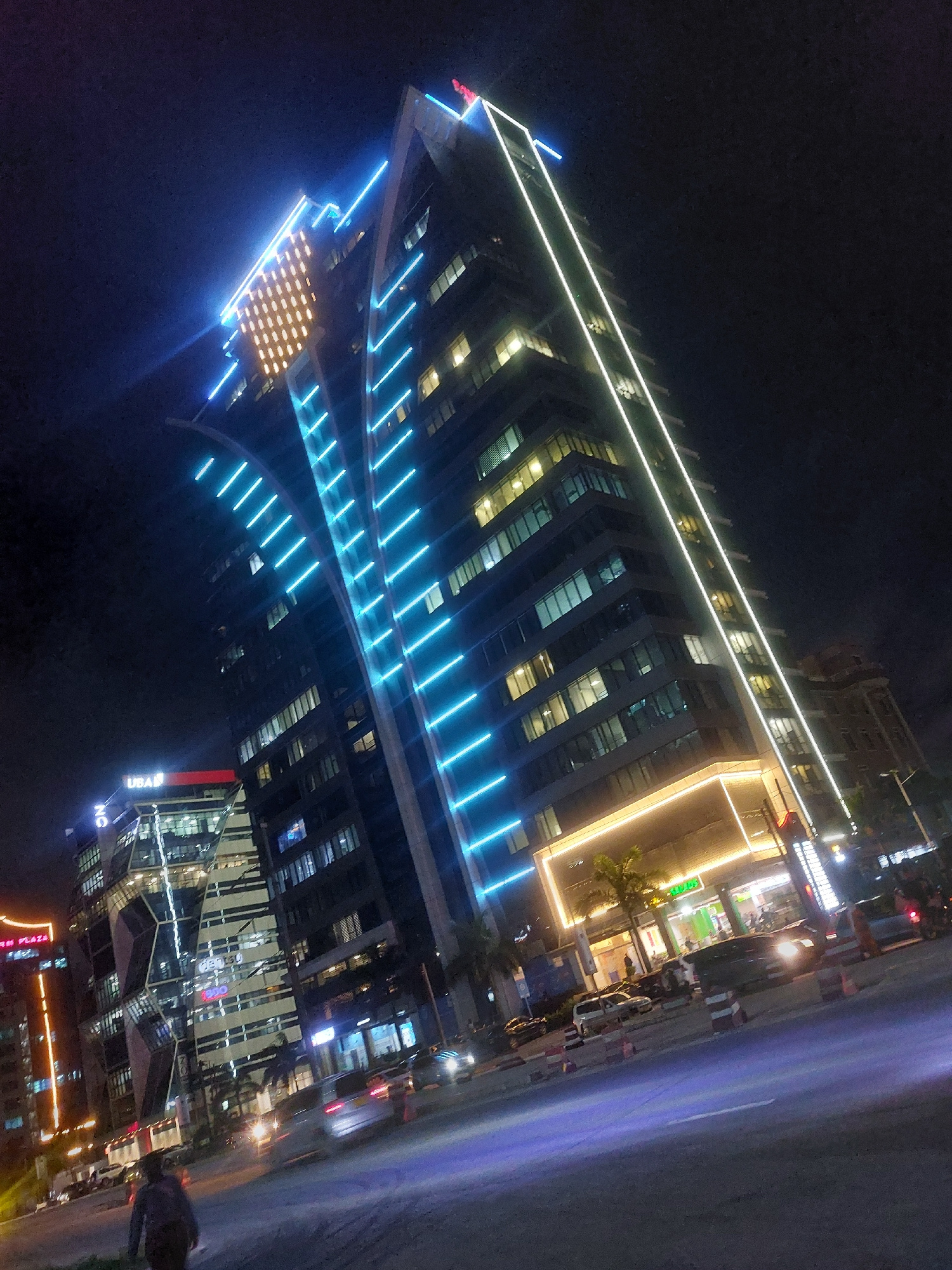 The image is of a building with blue and white lights at night. The building is located on a busy street with people walking by. There are cars parked along the side of the road. The building has a mo…read more