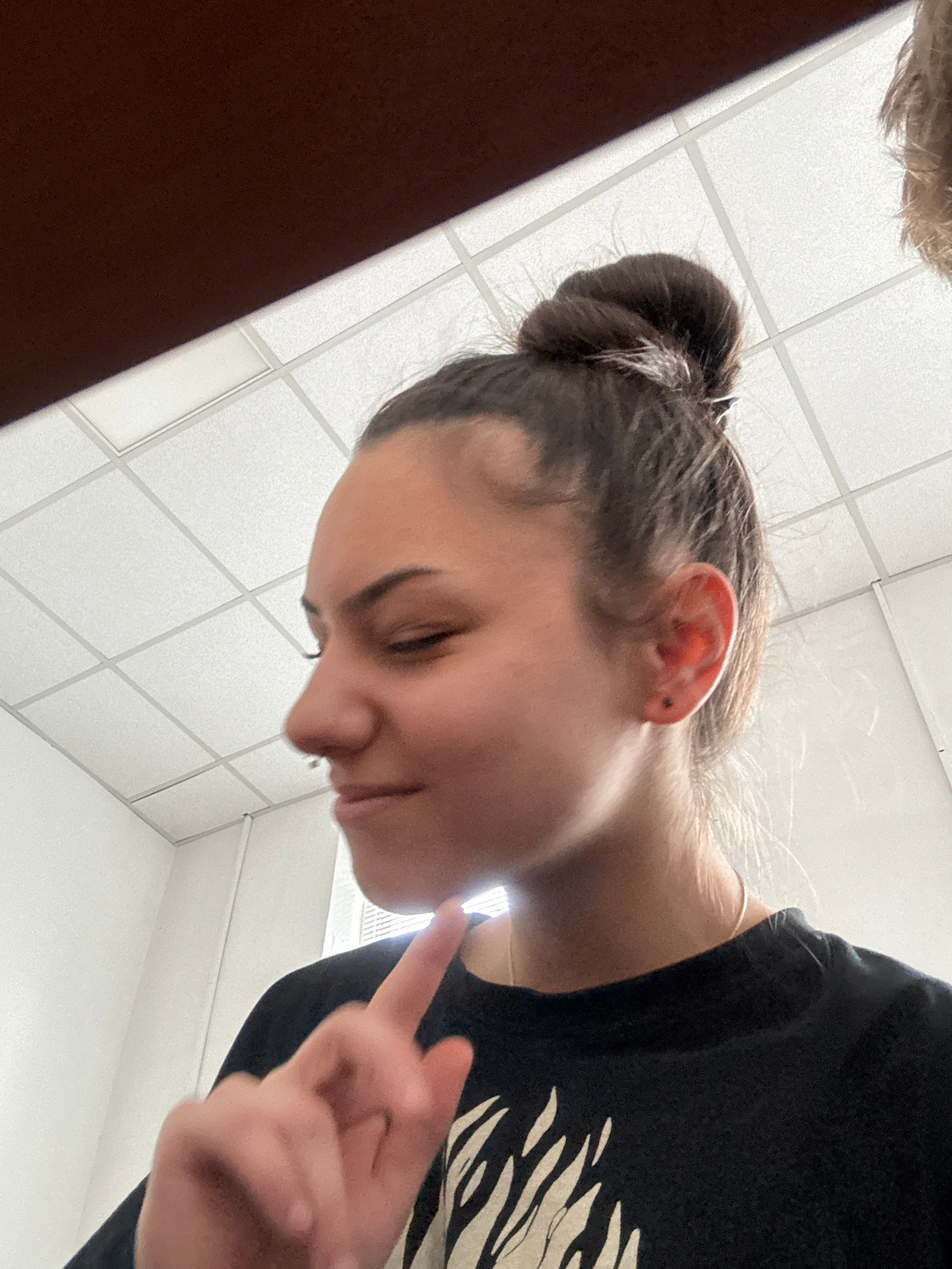 The image shows a person with brown hair styled in a bun, wearing a black shirt with a white design. The person is giving the middle finger. The background appears to be a room with tiled walls. The l…read more