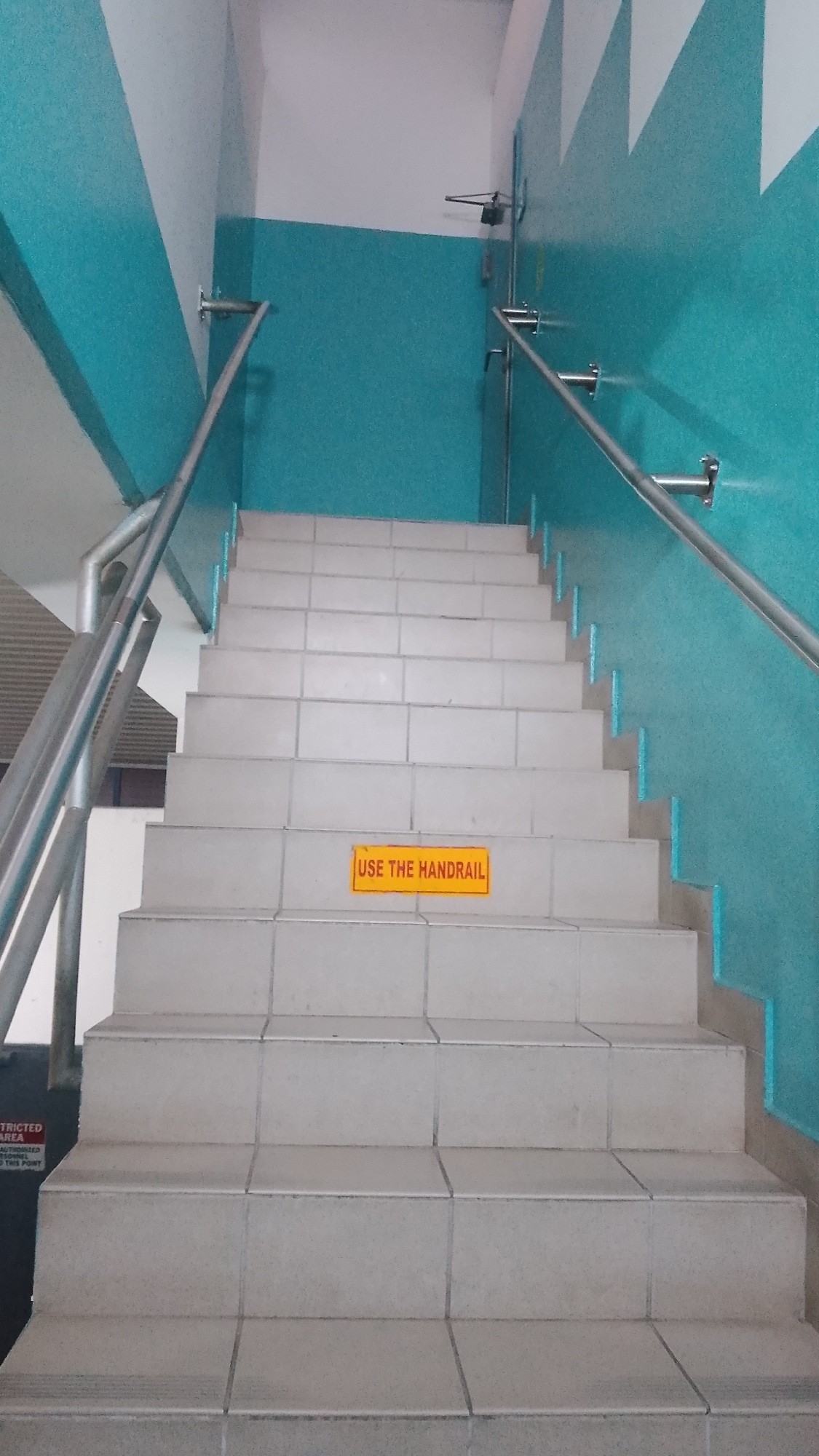 The image depicts a staircase in Orerokpe, Nigeria. The steps are made of light gray tiles. A yellow sign with black lettering "USE THE HANDRAIL" is adhered to one of the steps. Stainless steel handra…read more