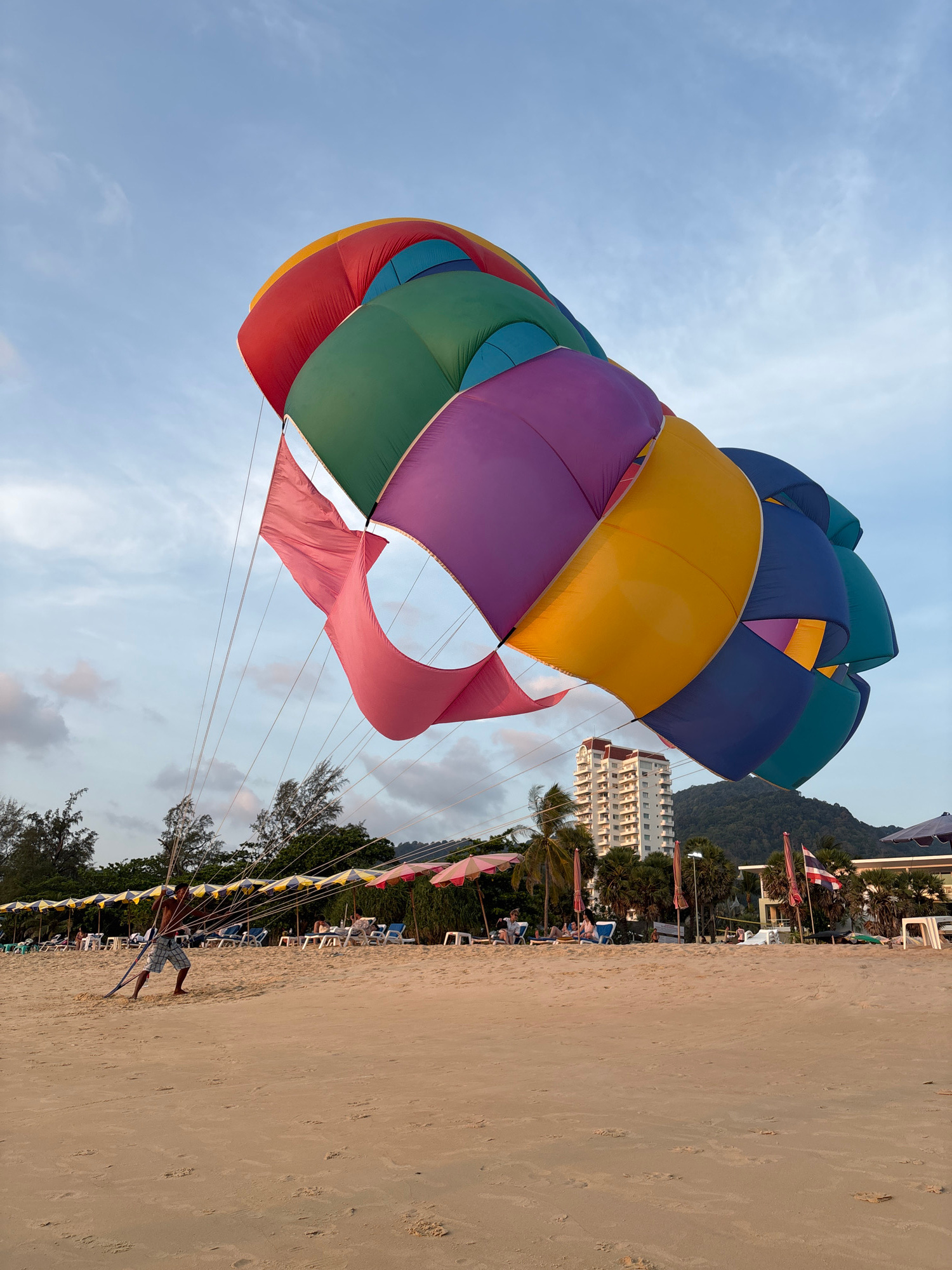 The image depicts a beach scene in Karon, Thailand, with a focus on a colorful parasail canopy. The canopy consists of sections in shades of red, green, purple, yellow, blue, and teal. Ropes extend fr…read more
