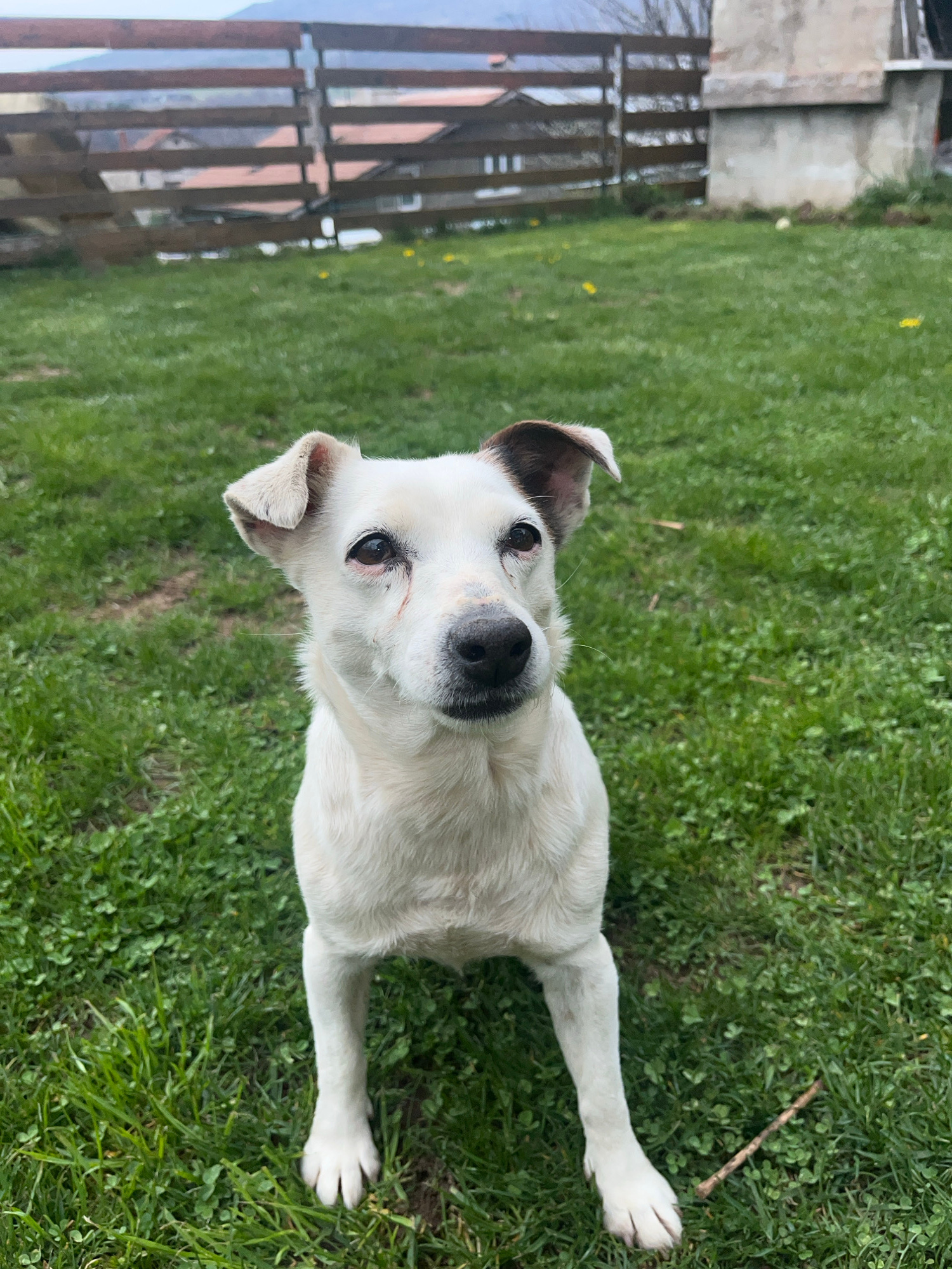 A white dog with short to medium-length fur is the central subject, looking directly at the camera with an attentive and curious expression. The dog has dark brown or black markings around its eyes an…read more