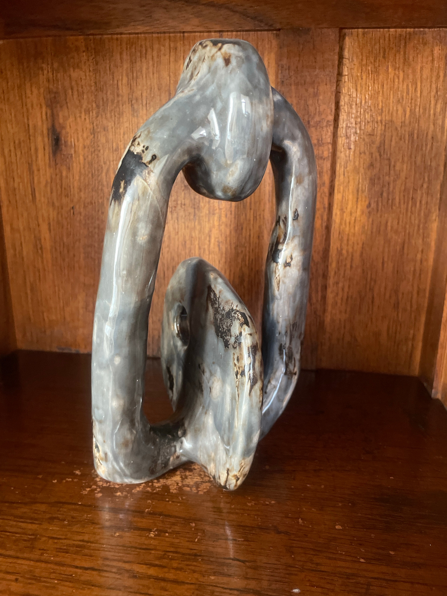 The image shows a ceramic object, possibly a decorative piece or handle, composed of two joined, rounded elements connected by curved bars, with a mottled grey and brown glaze, resting inside a wooden…read more