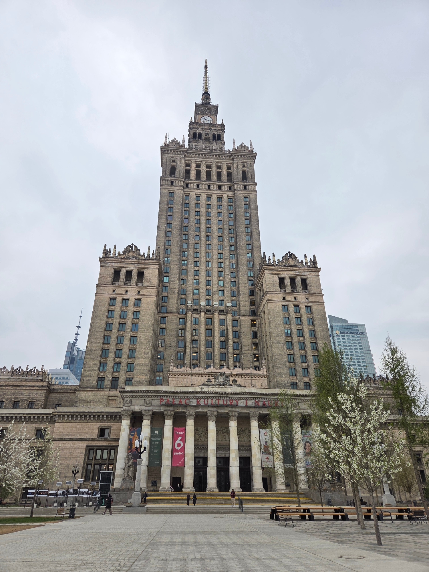 The image shows the Palace of Culture and Science in Warsaw, Poland. The monumental building, a socialist realist structure, dominates the scene. The facade is light brown with numerous windows. A tal…read more