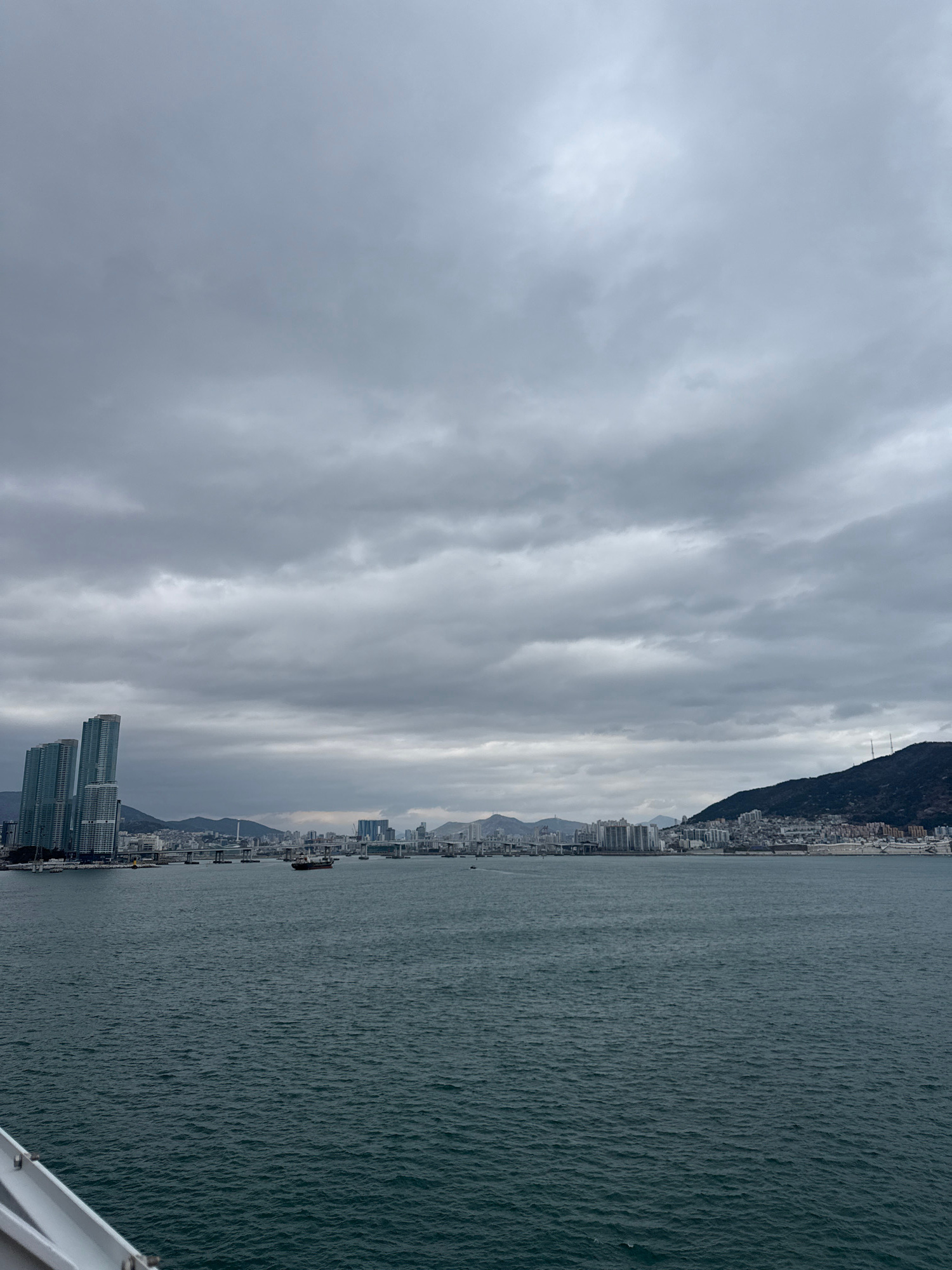 The image shows a view of the Busan skyline from the water, likely the sea. The sky is overcast with dense, layered clouds. To the right, the water is a dark, textured blue-gray. Buildings line the sh…read more