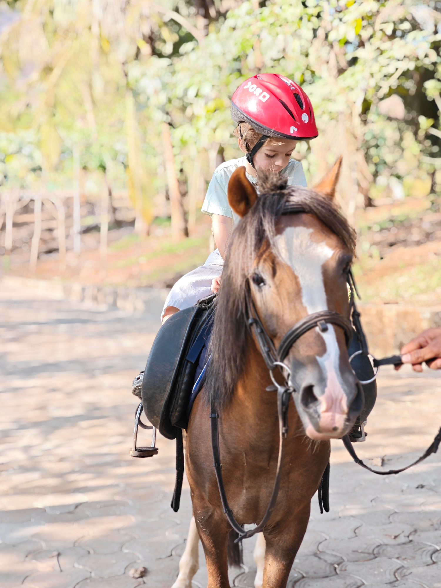 In Kalote Mokashi, India, a young child wearing a red helmet is seated on a small brown and white pony. The pony has a black saddle, stirrups, and bridle, and a hand is visible holding its lead rope.…read more