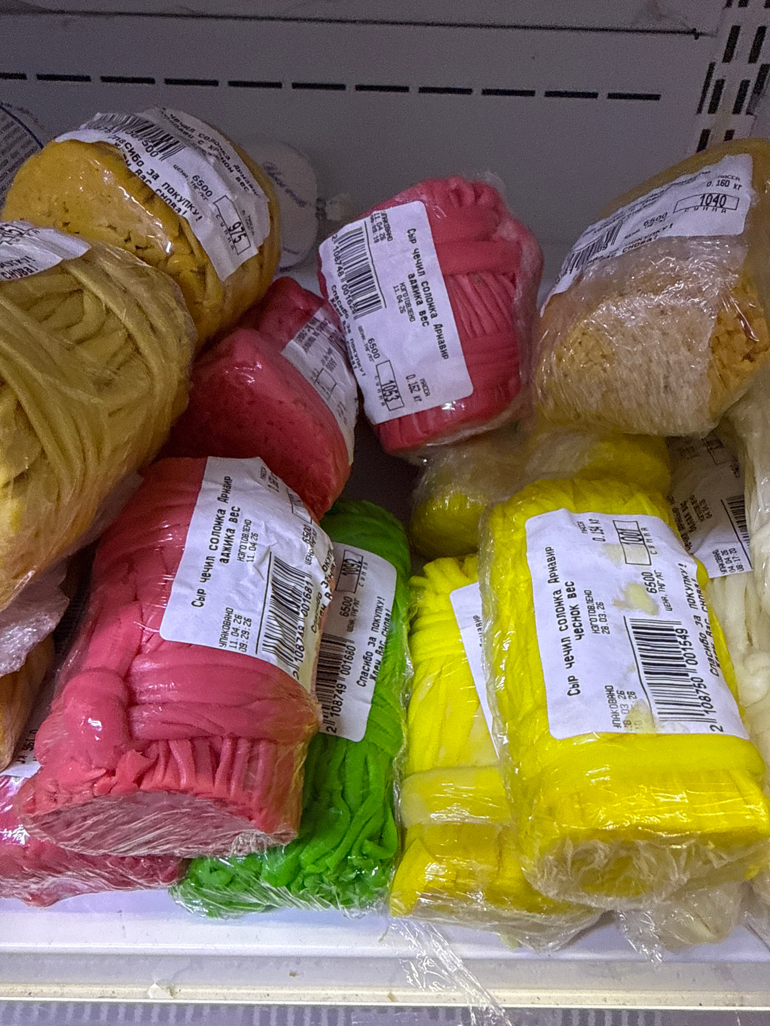 The image shows an assortment of colorful string cheeses, likely in a refrigerated display case at a store, with labels in Russian indicating they are "Syr chechil solonka" (string cheese) of the "Arnβ¦read more