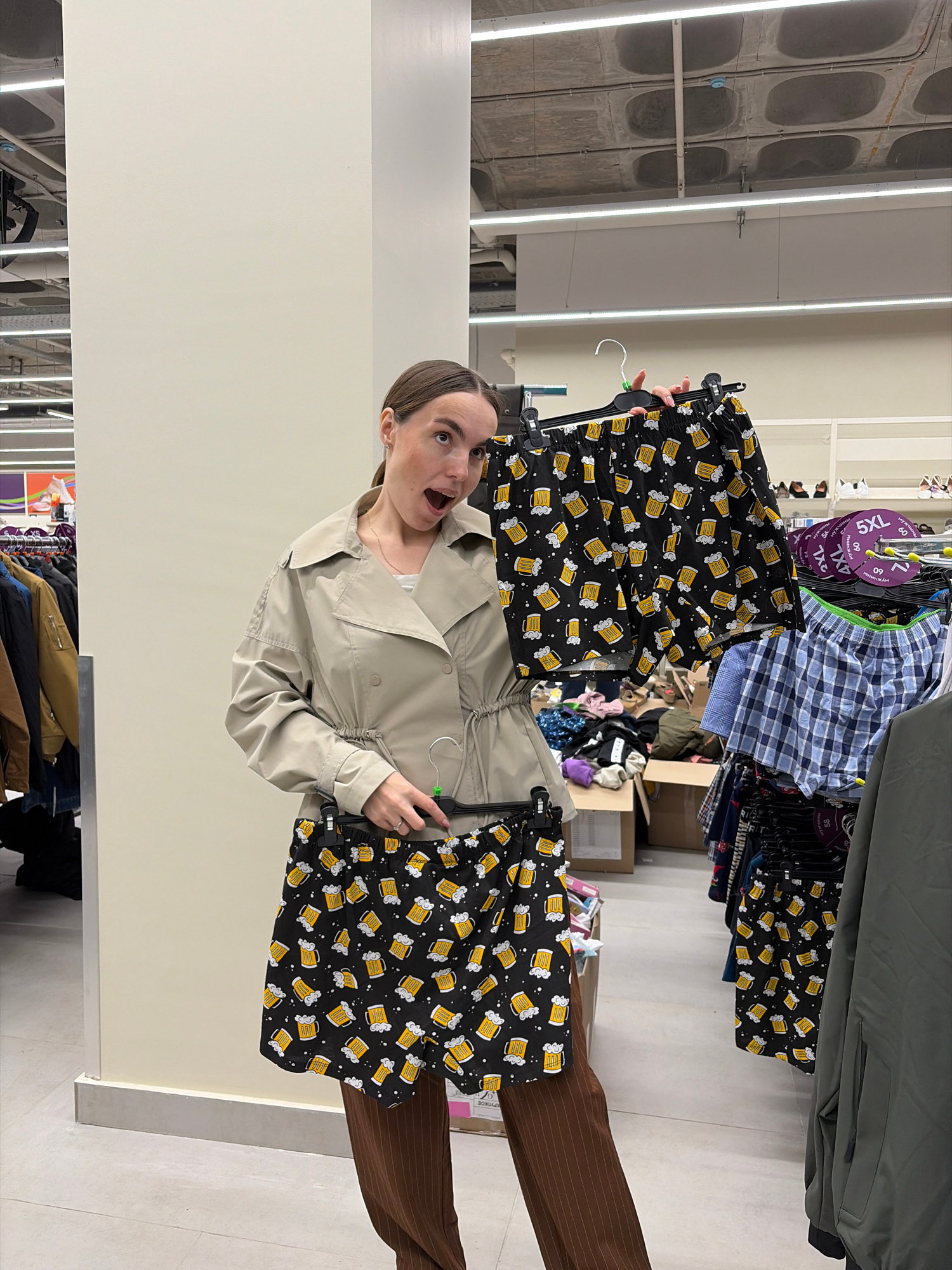 A young woman in a retail store in Izhevsk, Russia, holds up a pair of black boxer shorts decorated with a repeating pattern of yellow beer mugs, displaying an expression of surprise or excitement wit…read more