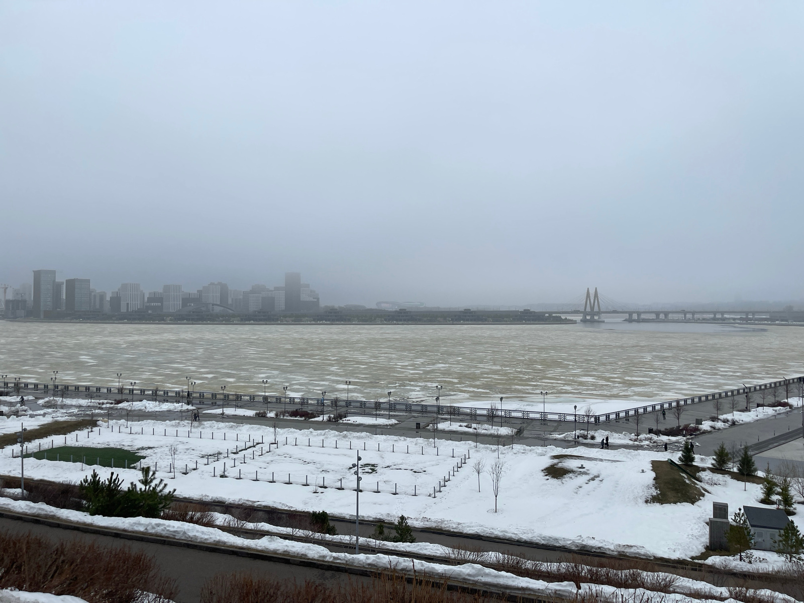 This image depicts a winter scene in Kazan, Russia, specifically showing a view of the Kazanka River and the cityscape beyond it, obscured by overcast skies. The river is largely frozen over with patc…read more