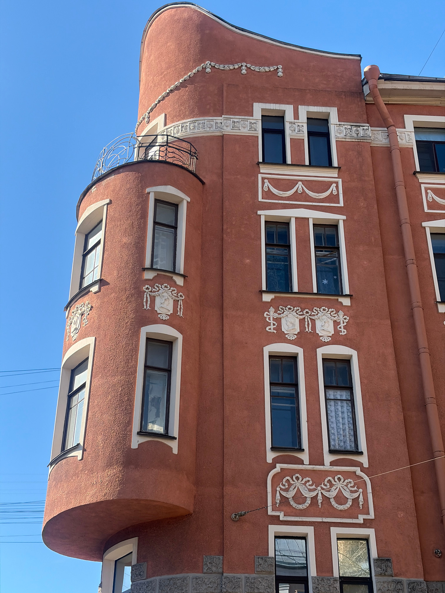 This image captures the richly decorated facade of a multi-story building, likely located in Saint Petersburg, Russia, set against a bright, clear blue sky on a sunny day. The building is painted in a…read more