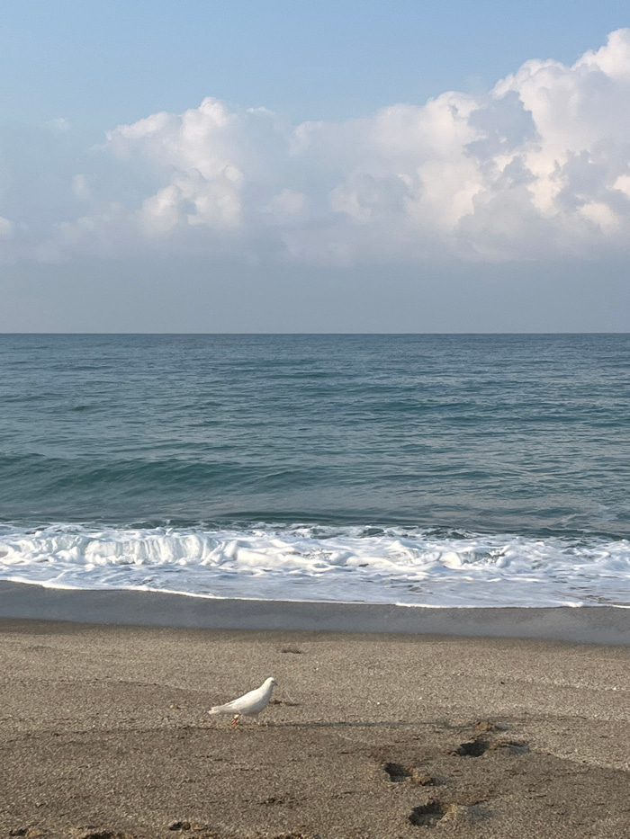 The image displays a coastal scene in Alanya, Turkey. The lower third of the frame features a light brown sandy beach. A single white pigeon stands prominently on the sand in the lower-left quadrant,…read more