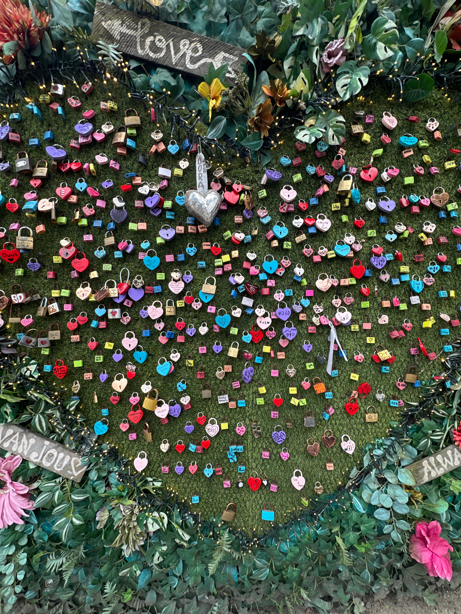 The image captures a "love lock" display, seemingly a wall or surface covered with numerous colorful padlocks, primarily heart-shaped or small rectangular ones, attached to a green, grass-like surface…read more