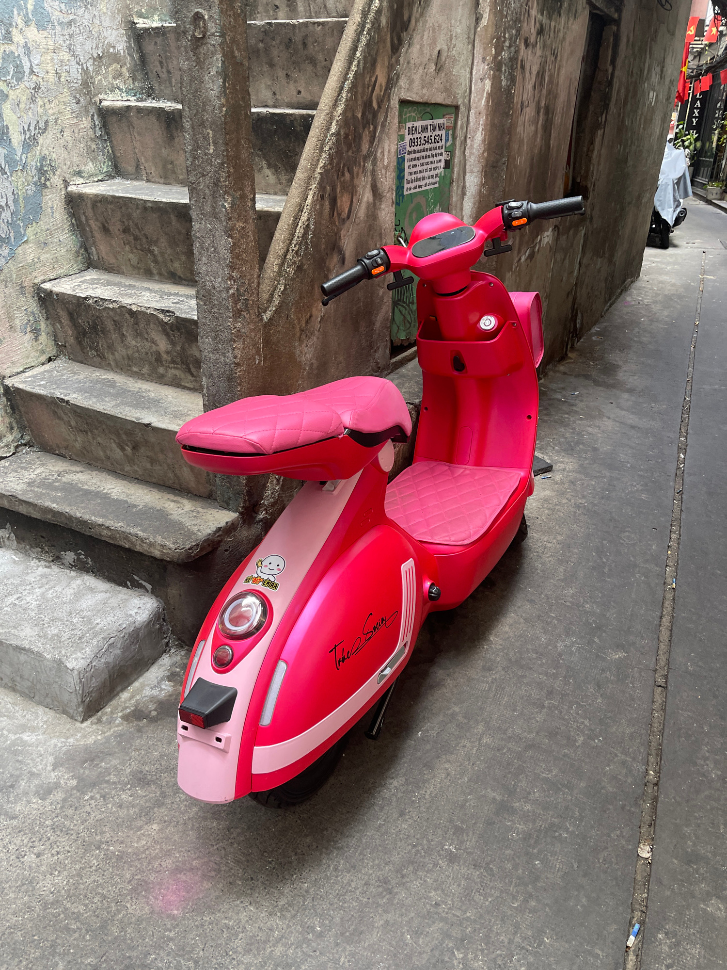 The image depicts a pink scooter parked on a concrete surface in what appears to be a narrow alleyway. The scooter has a shiny pink and light pink color scheme, a quilted seat, and decorative decals.…read more