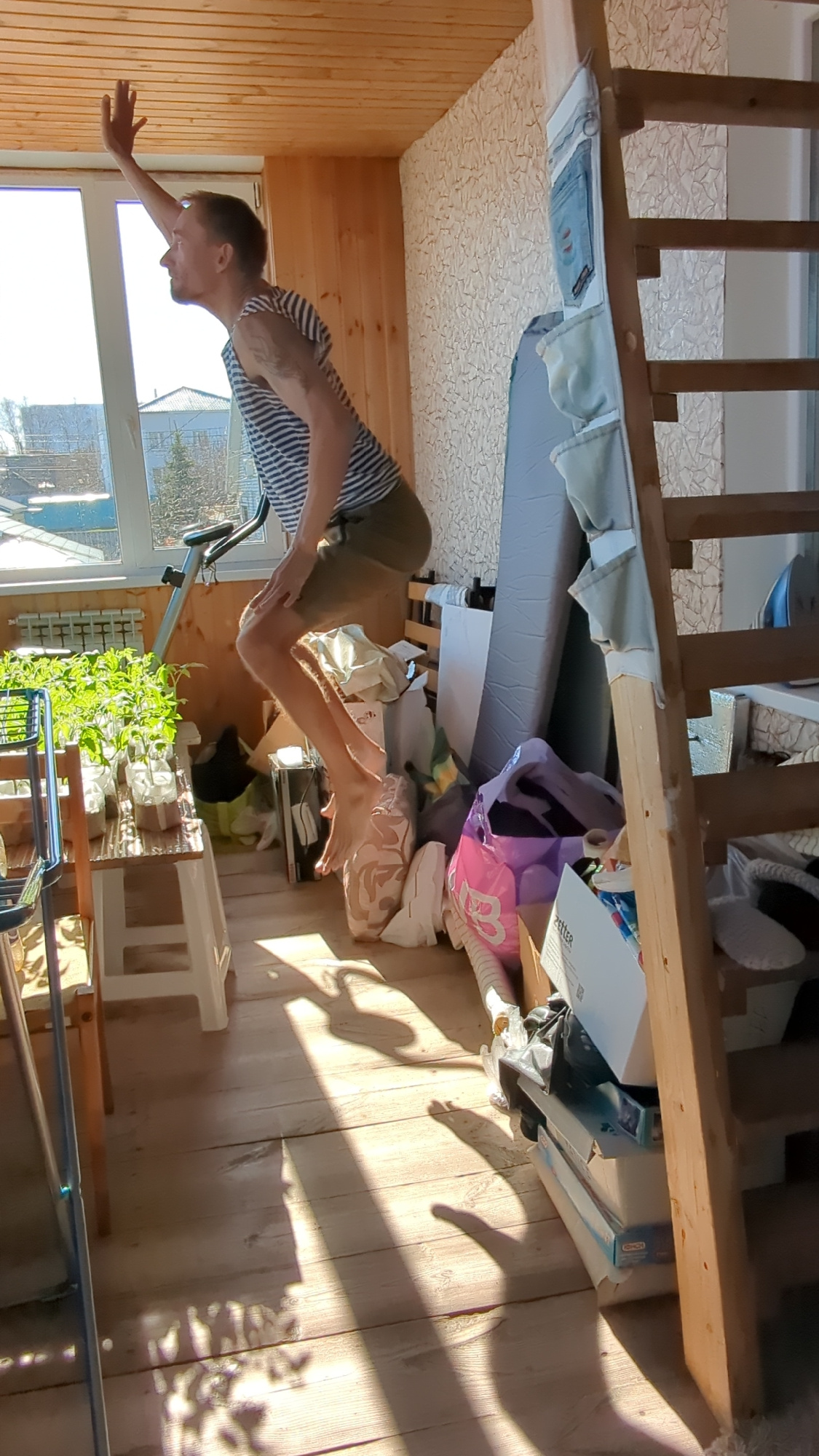 The image portrays an indoor residential scene, likely a room or attic space in Ulyanovsk, Russia, illuminated by strong natural light. A man is captured in a balanced pose, performing an exercise or…read more