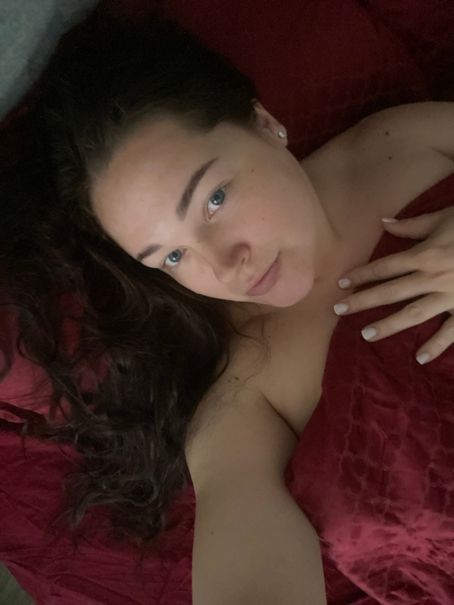 A woman with long, dark curly hair, fair skin, and blue eyes is lying on a red bedspread. Her right hand rests on her chest. The image suggests an indoor setting. No information indicates the location…read more