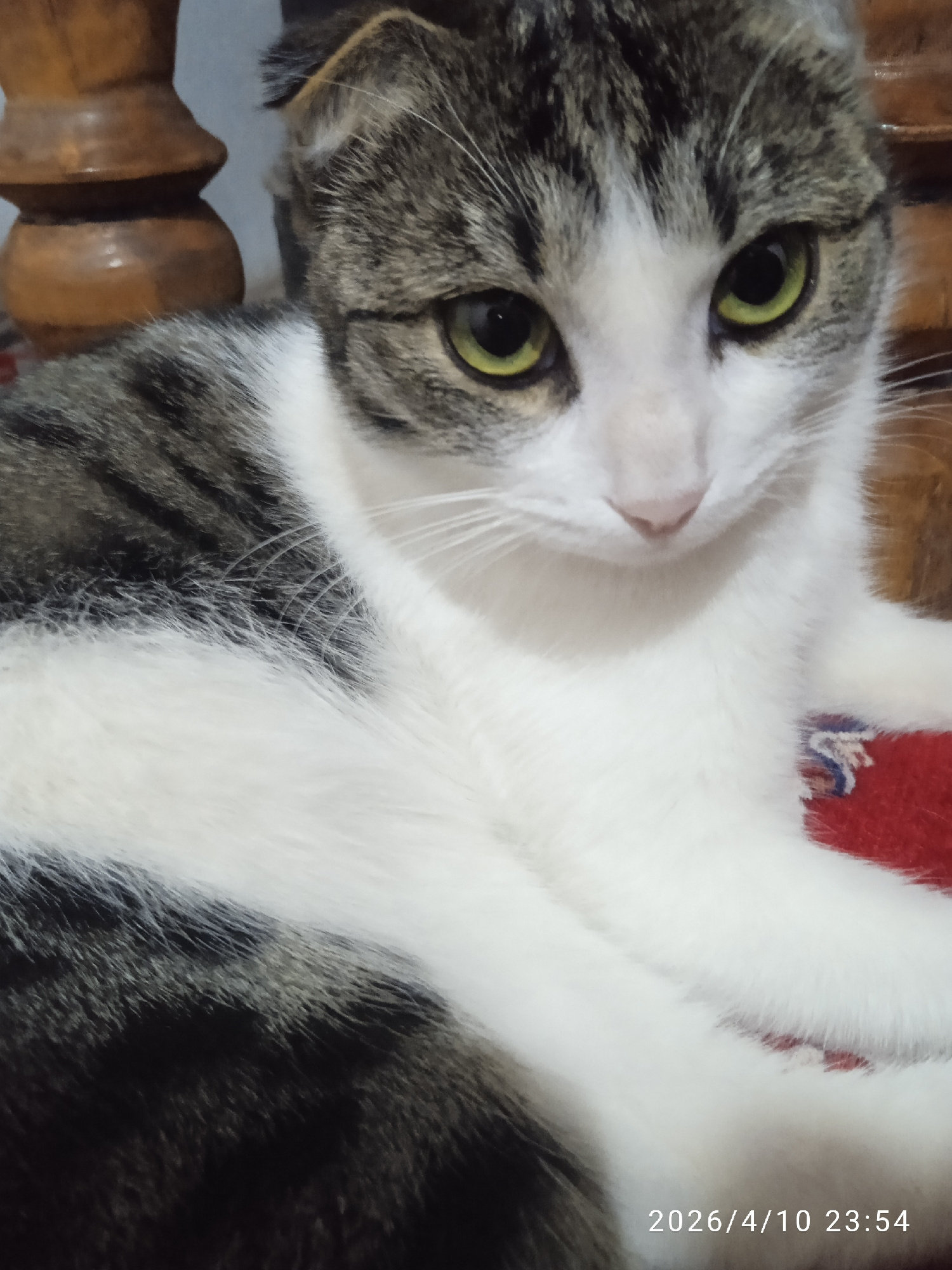 A close-up shot shows a gray and white cat with yellow-green eyes. The cat is lying down, with its front paws visible. The background includes a wooden object and a red surface, possibly a rug or blan…read more