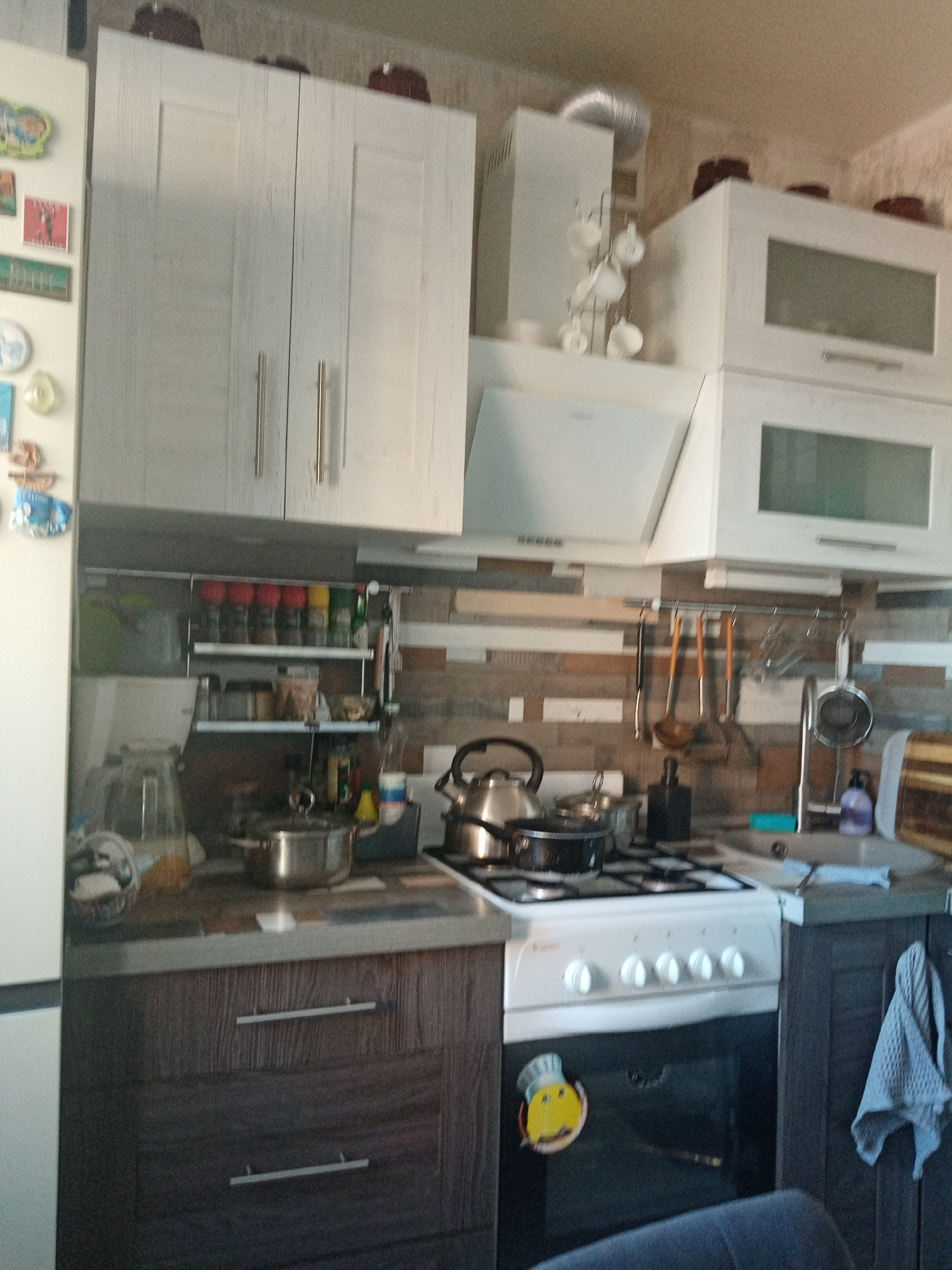 The image depicts a kitchen interior. Overhead are white cabinets. Under the cabinets, there's a variety of items including spice racks, cooking utensils, and a range with pots and kettles on the stov…read more