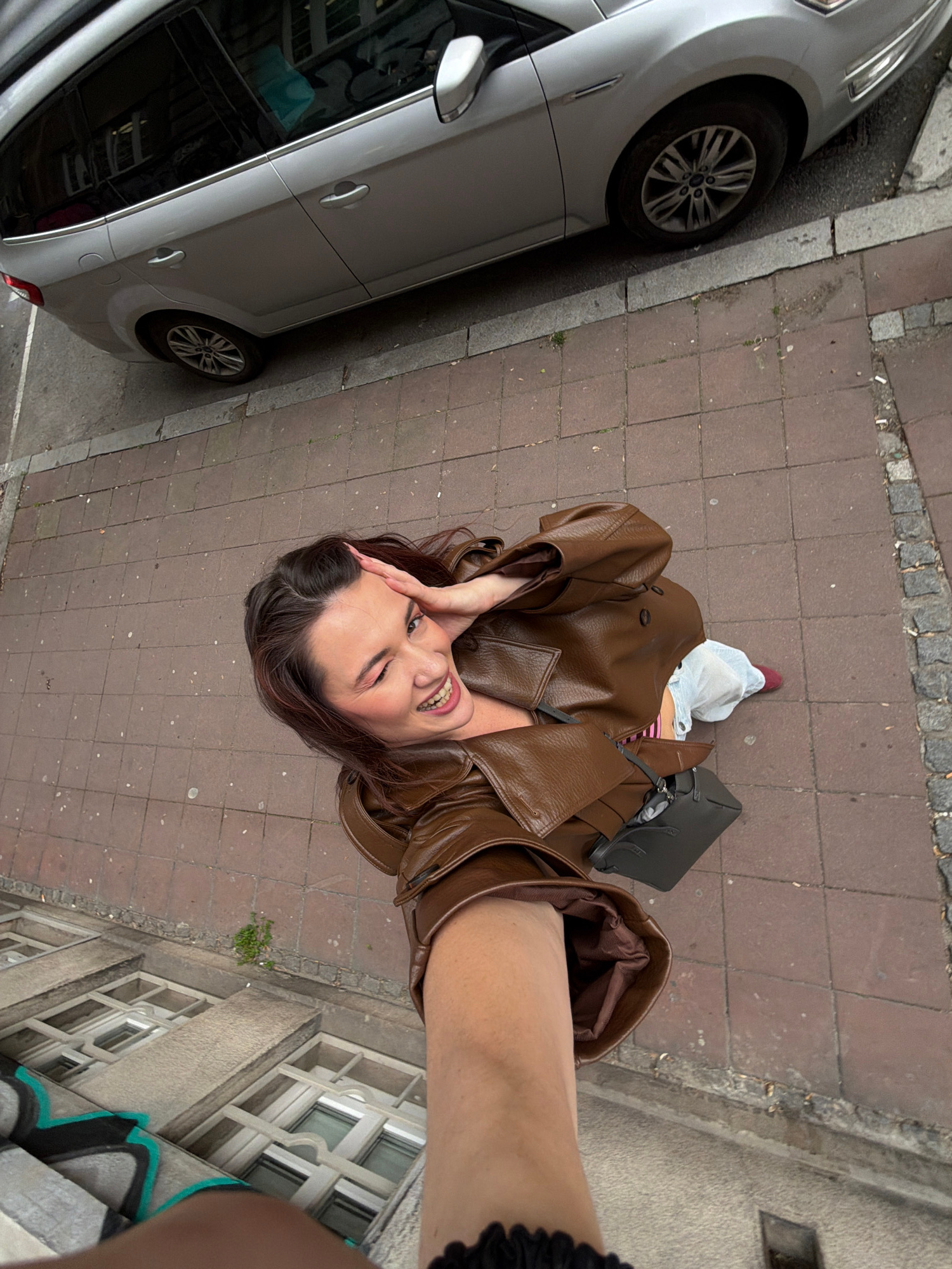 A woman in a brown leather jacket takes a selfie on a sidewalk in Belgrade, Serbia. A gray car is parked on the left side of the frame, partially obscuring the view of the street. The sidewalk is pave…read more