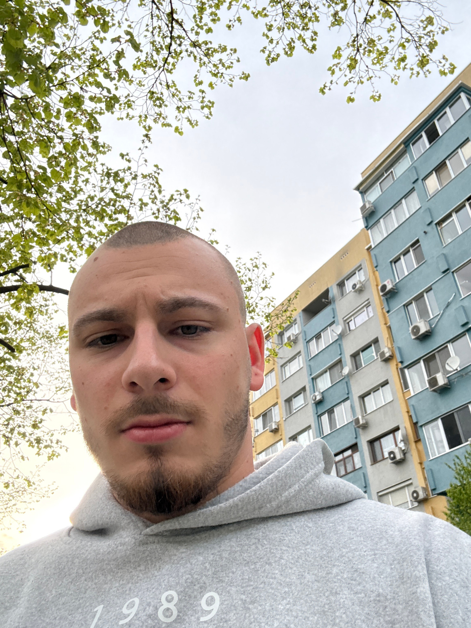 A low-angle outdoor selfie features a young man against a backdrop of an urban building and trees. The image is presented rotated 90 degrees clockwise. The man, with a shaved head and short beard, occ…read more