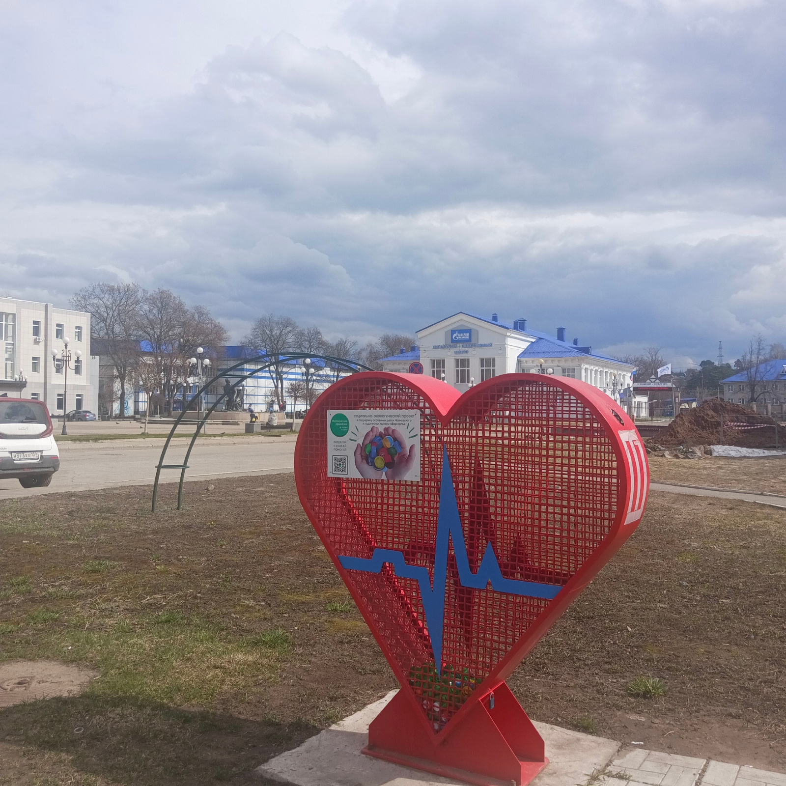 The image shows a large, red, heart-shaped structure in the foreground, likely a container for collecting plastic bottle caps, located in Chaikovsky, Russia. A blue ECG waveform is affixed to the struβ¦read more