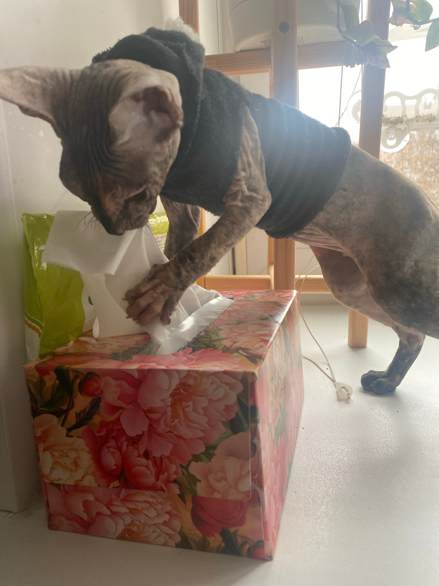 A hairless cat wearing a dark-colored sweater is pulling tissues from a floral-patterned tissue box. The cat is standing on its hind legs, with one paw on the tissue box. The scene appears to be indoo…read more