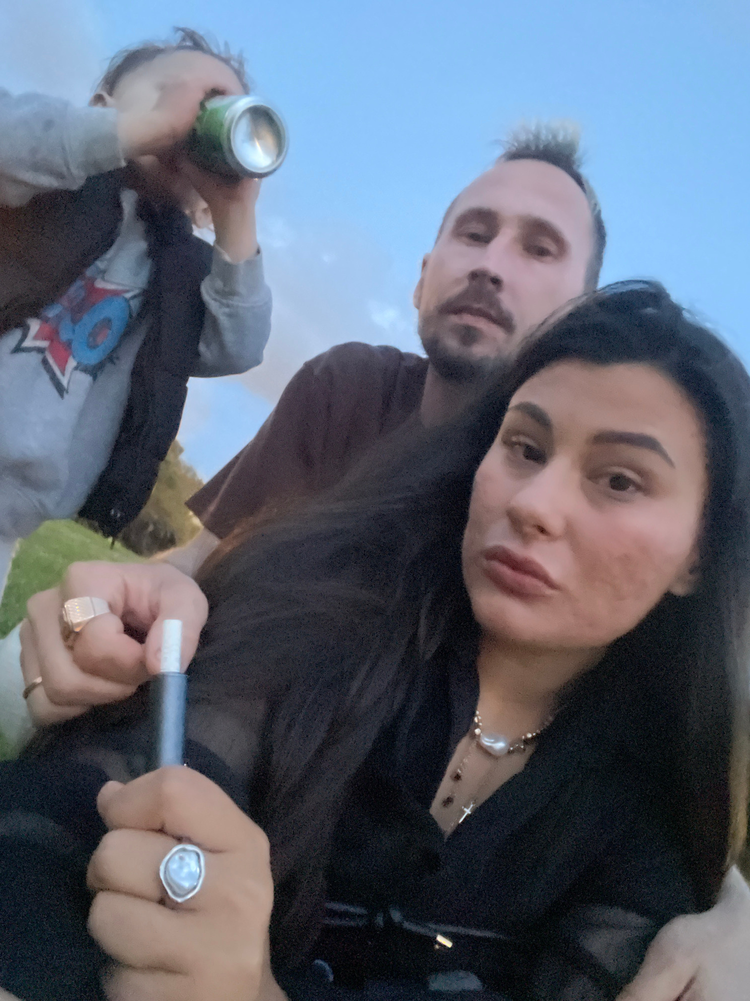 The image shows three people, likely family members, posing for a selfie against a blue sky backdrop. The woman in the center holds a vape pen, with her other hand adorned with multiple rings. A man s…read more