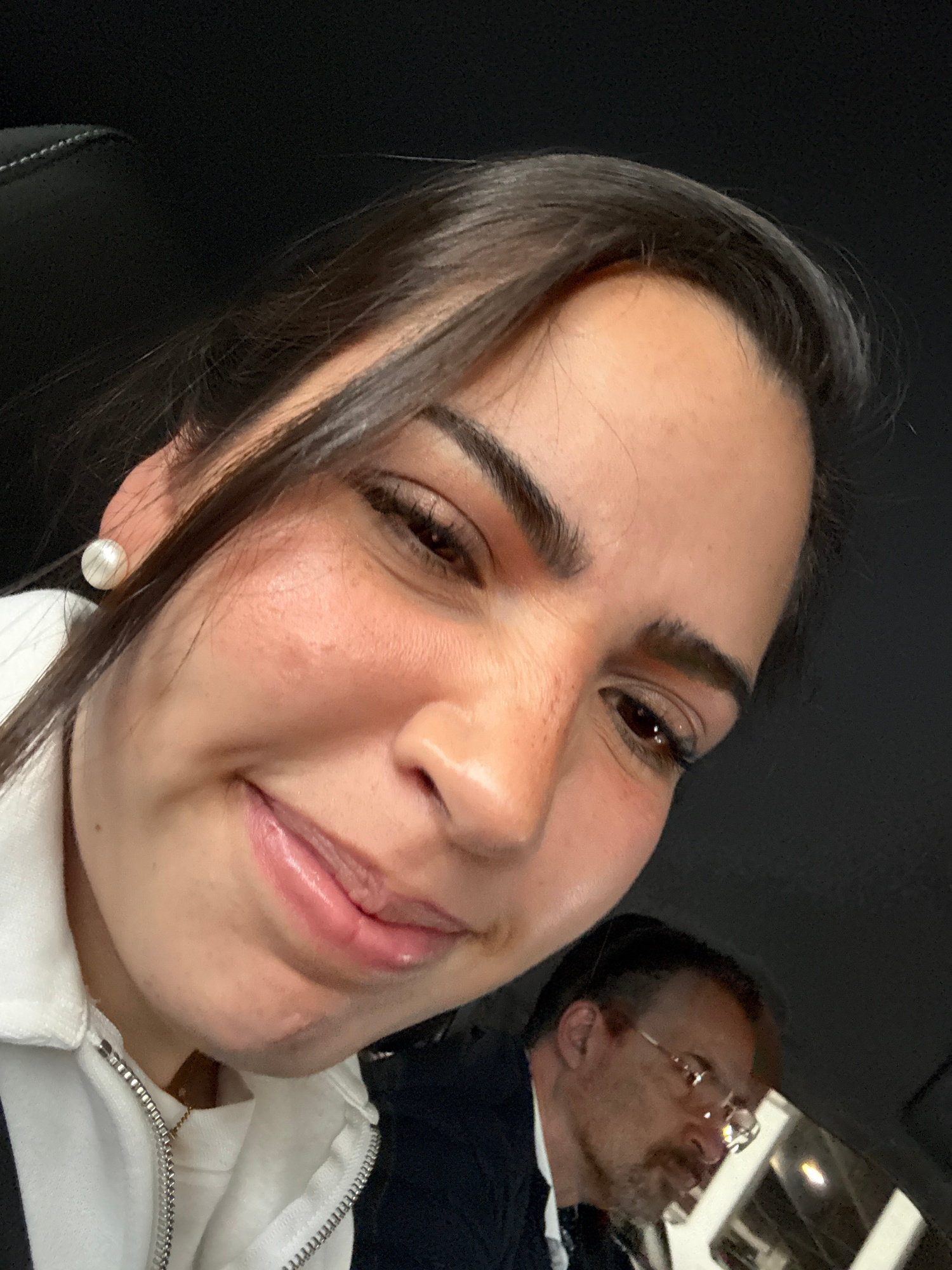 A close-up selfie shows a woman with dark hair and a slight smile, wearing a white zippered jacket and pearl earrings. An older man with glasses is seated behind her, in soft focus. The background inc…read more