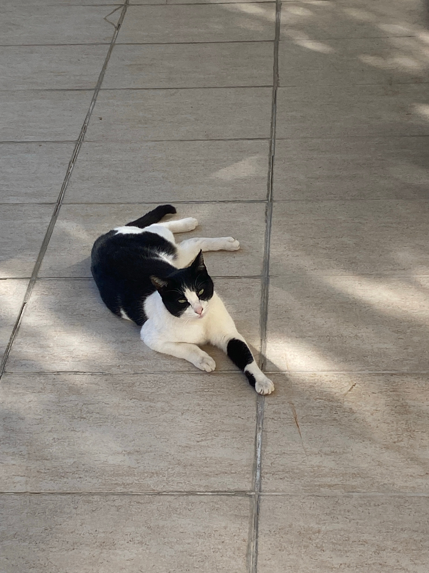 A black and white cat is lying on a light gray tile surface. The cat is positioned towards the upper right of the frame, with its hind legs stretched out towards the top right corner. The cat's head i…read more