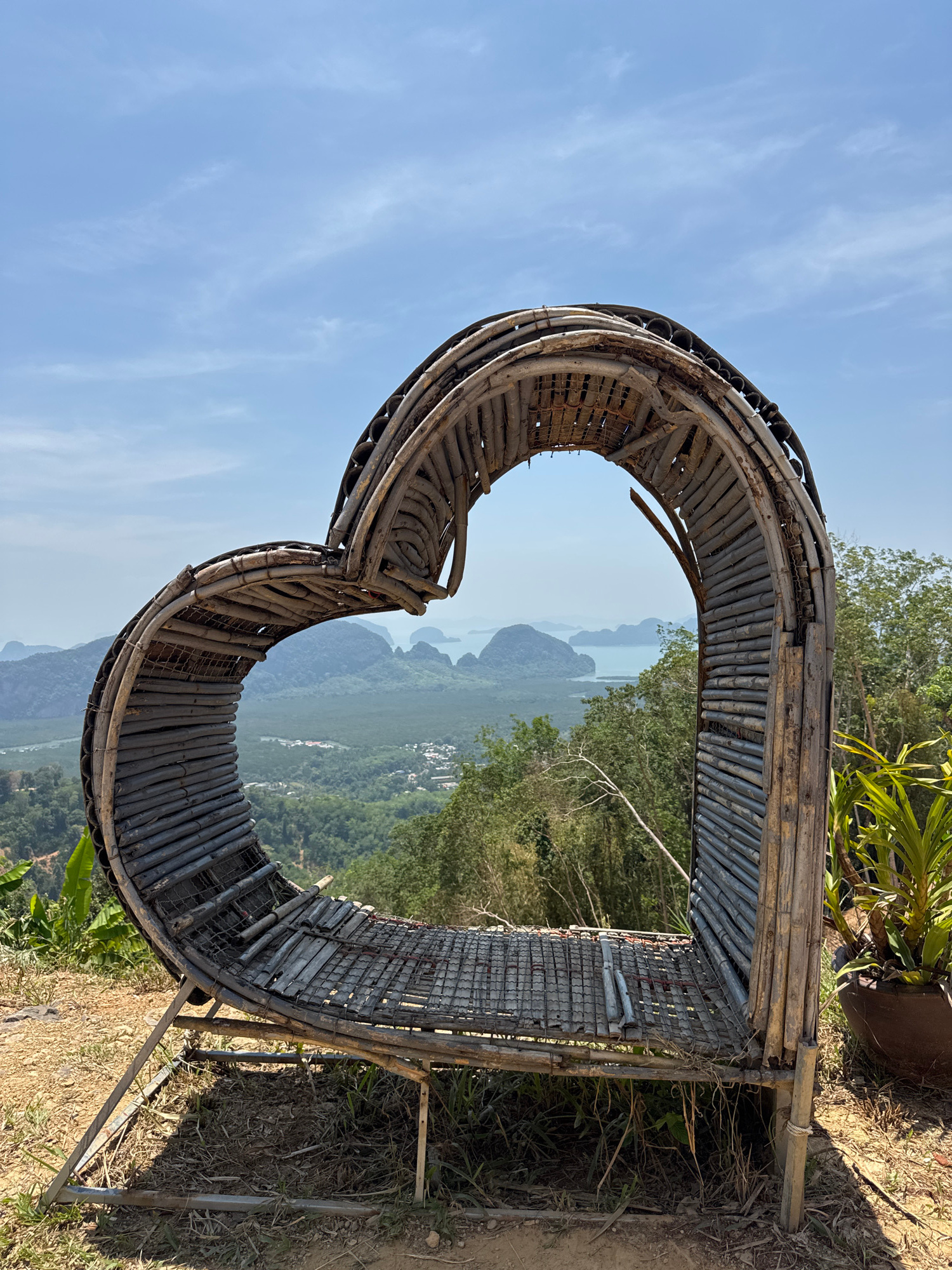 A horizontal, medium-shot photograph shows a large, heart-shaped frame crafted from bamboo and metal against a scenic backdrop. The structure is positioned on an elevated point, framing a landscape of…read more