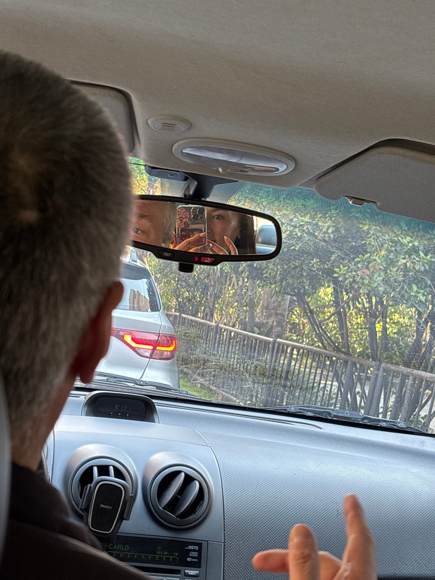 A view from inside a car in what appears to be a traffic jam. The rear-view mirror shows a person reflected, holding a smartphone. Outside, trees and a metal railing are visible. A silver car is in fr…read more