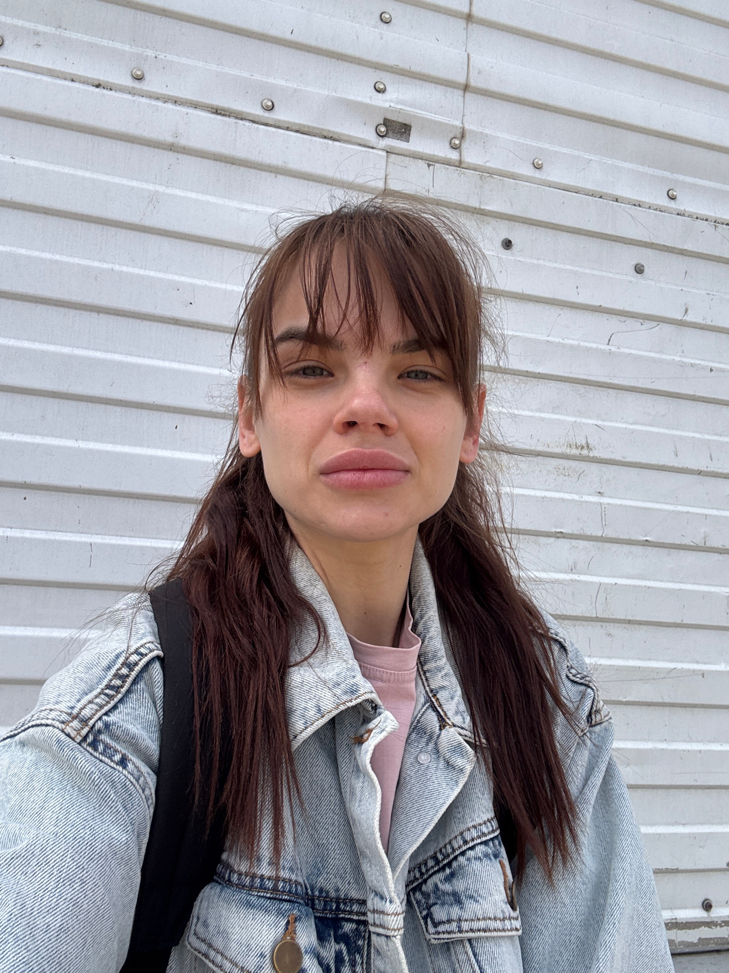 A young woman with brown hair and bangs, wearing a light blue denim jacket over a pink shirt, is posing for a selfie. The background is a white, corrugated metal wall. The scene may be in Rostov-on-Do…read more