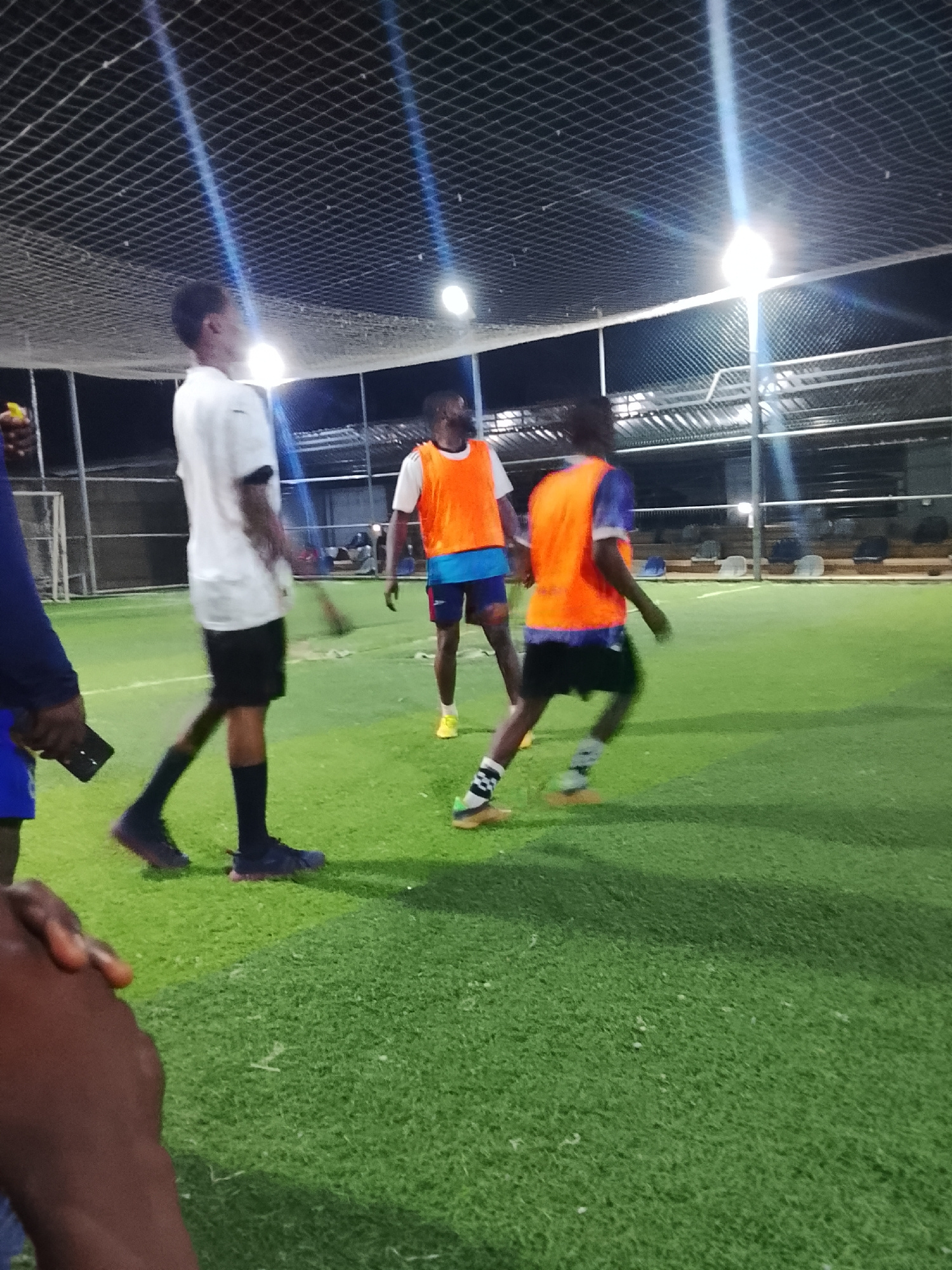 The image shows a group of young men playing soccer on an artificial turf field at night in what appears to be a caged or enclosed area. Overhead netting is visible, along with several bright lights i…read more