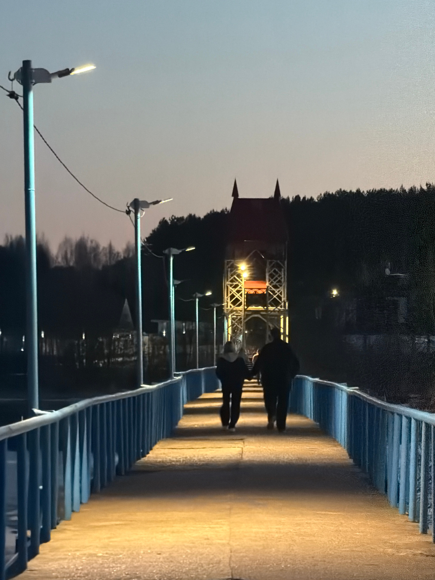 The image captures a scene on a bridge in Izhevsk, Russia, at dusk. Two people are walking on the bridge towards a metal tower illuminated with lights. The bridge has blue railings, and lampposts are…read more